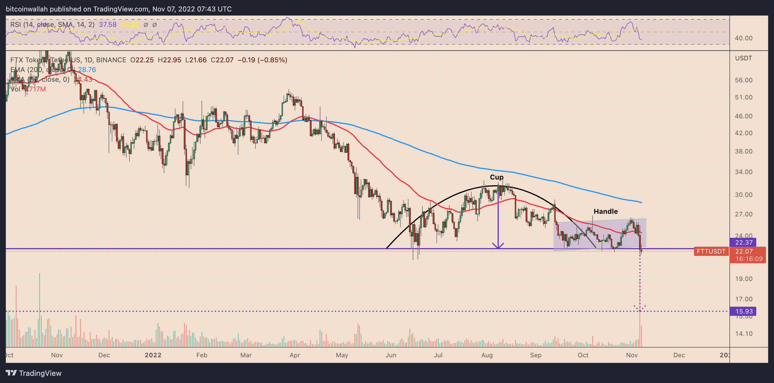 On Nov. 6, FTT broke below the pattern's support line near $22.50, accompanied by a volume spike. The FTX exchange token's selloff continued on Nov. 7 below the support line, raising risks of a bearish continuation phase in the coming months.