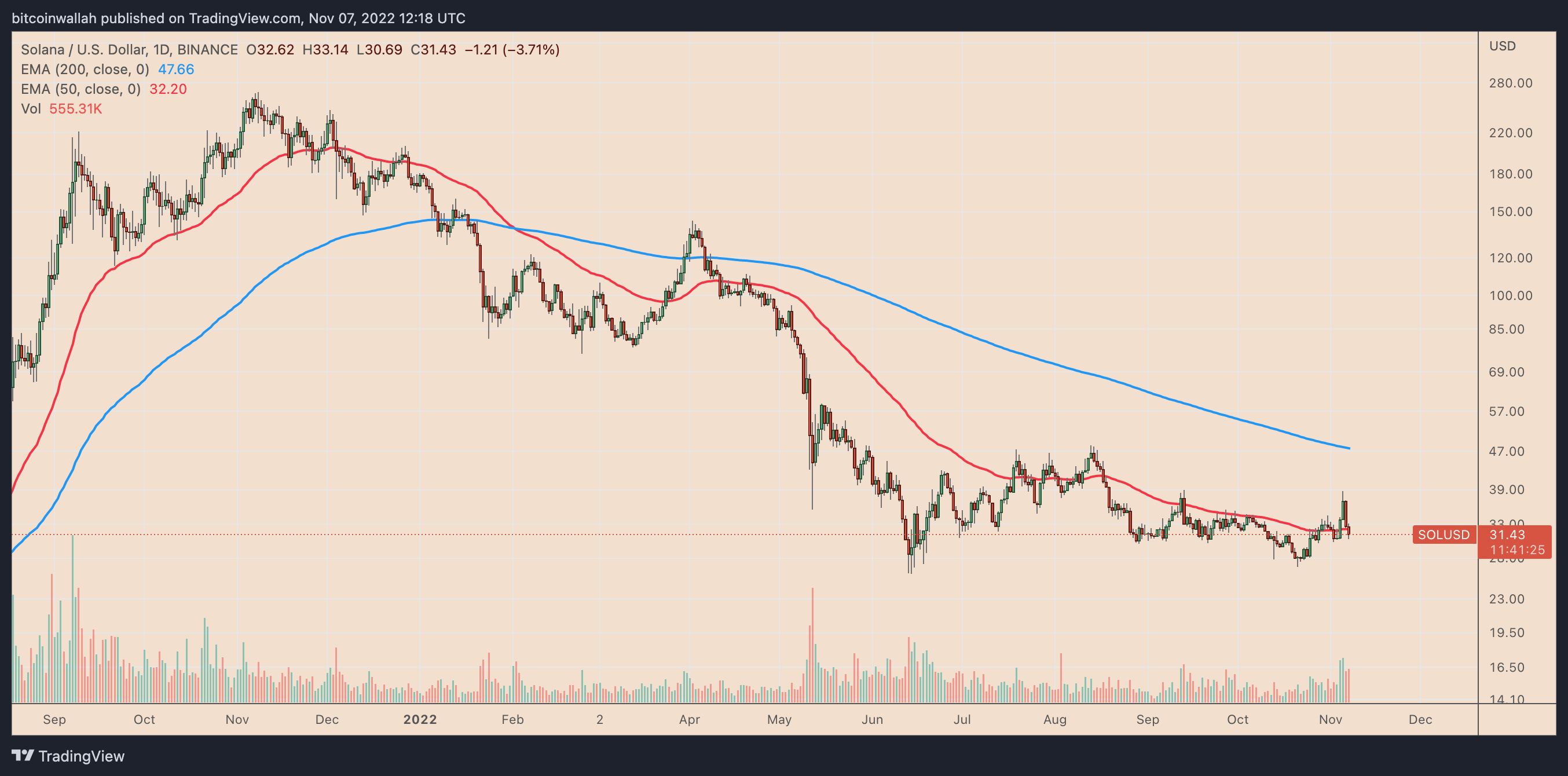 On Nov. 7, SOL's price plunged nearly 6% to about $30.50. The intraday selloff came as a part of a broader pullback trend that started on Nov. 5 when SOL peaked at around $38.75. Between then and now, the Solana token is down over 20%.