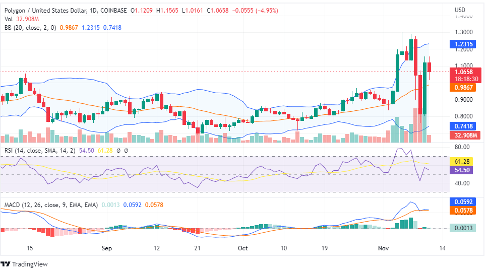 On the daily chart, we can find too much volatility for the short term. After facing the resistance of around $1.25, MATIC reached strong short-term support of around $0.76 within 24 hours. Now it is trading around $1, and candlesticks are forming around the baseline of the Bollinger Bands.