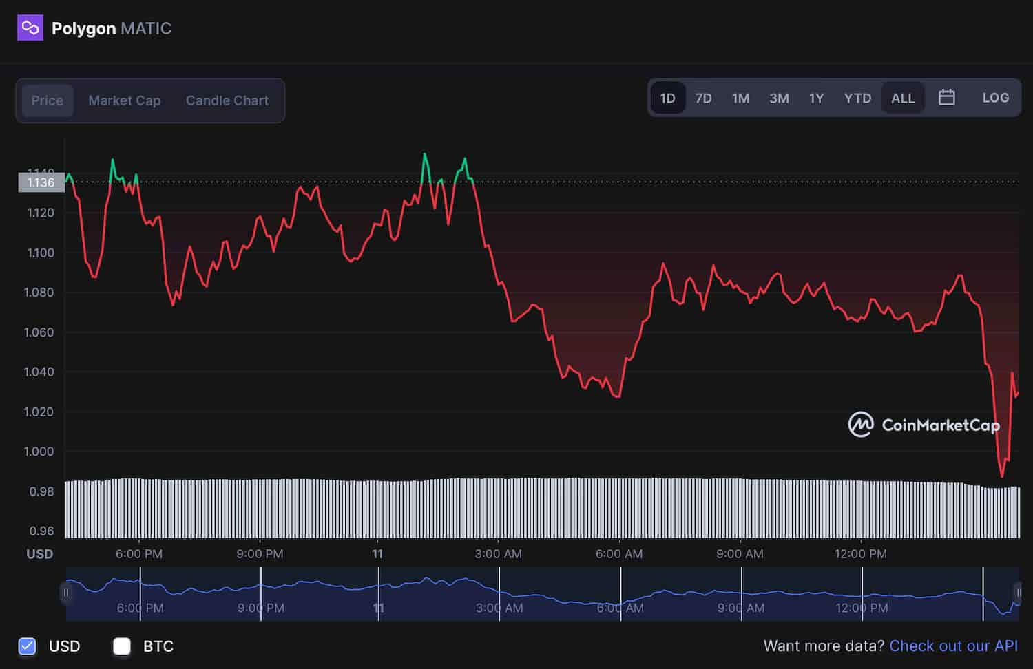 Currently, MATIC is selling for $1.02, down 10.19% in the last 24 hours and 10.25% in the last seven days, according to CoinMarketCap data.