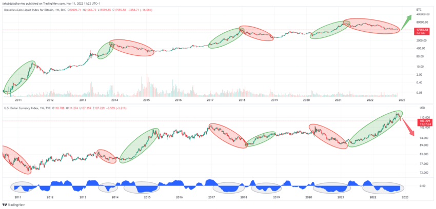 If the U.S. dollar index has indeed peaked in the current cycle, it is possible that Bitcoin is close to generating – or has already done so at $15,588 – a macro bottom. However, if the DXY rebounds and resumes its post-correction rally, the cryptocurrency market — plagued by its own problems like the recent collapse of FTX — and BTC could face much lower prices.