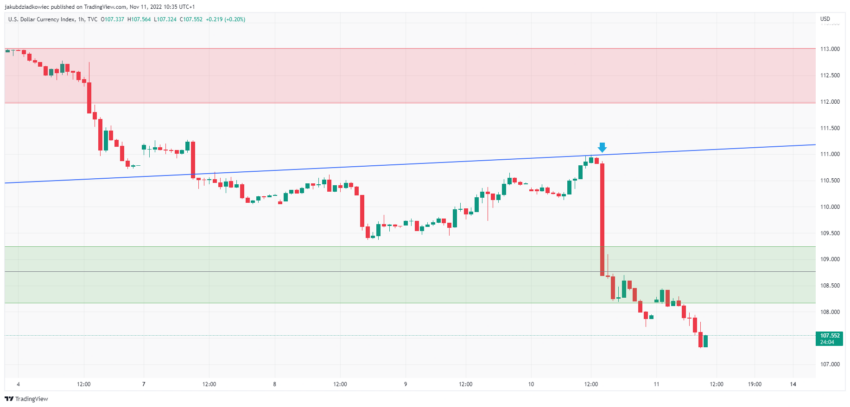 Shortly after the release of U.S. inflation data for October, the U.S. dollar index saw a sharp decline. The DXY lost almost 2% within an hour (blue arrow), falling to a support area in the 108-109 range (green).