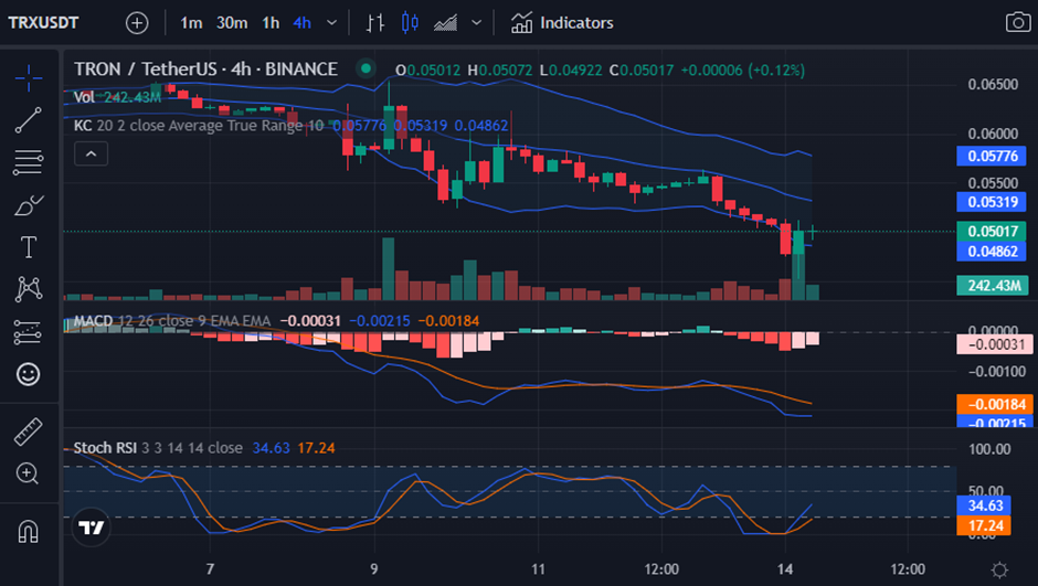 Keltner Channels bands are pointing south on the 4-hour price chart, with the upper band touching 0.05776 and the lower band touching 0.04842. The broadening of their bands implies greater selling pressure, as evidenced by the 109.53% increase in its 24-hour trading volume, implying that a bearish run is inevitable.