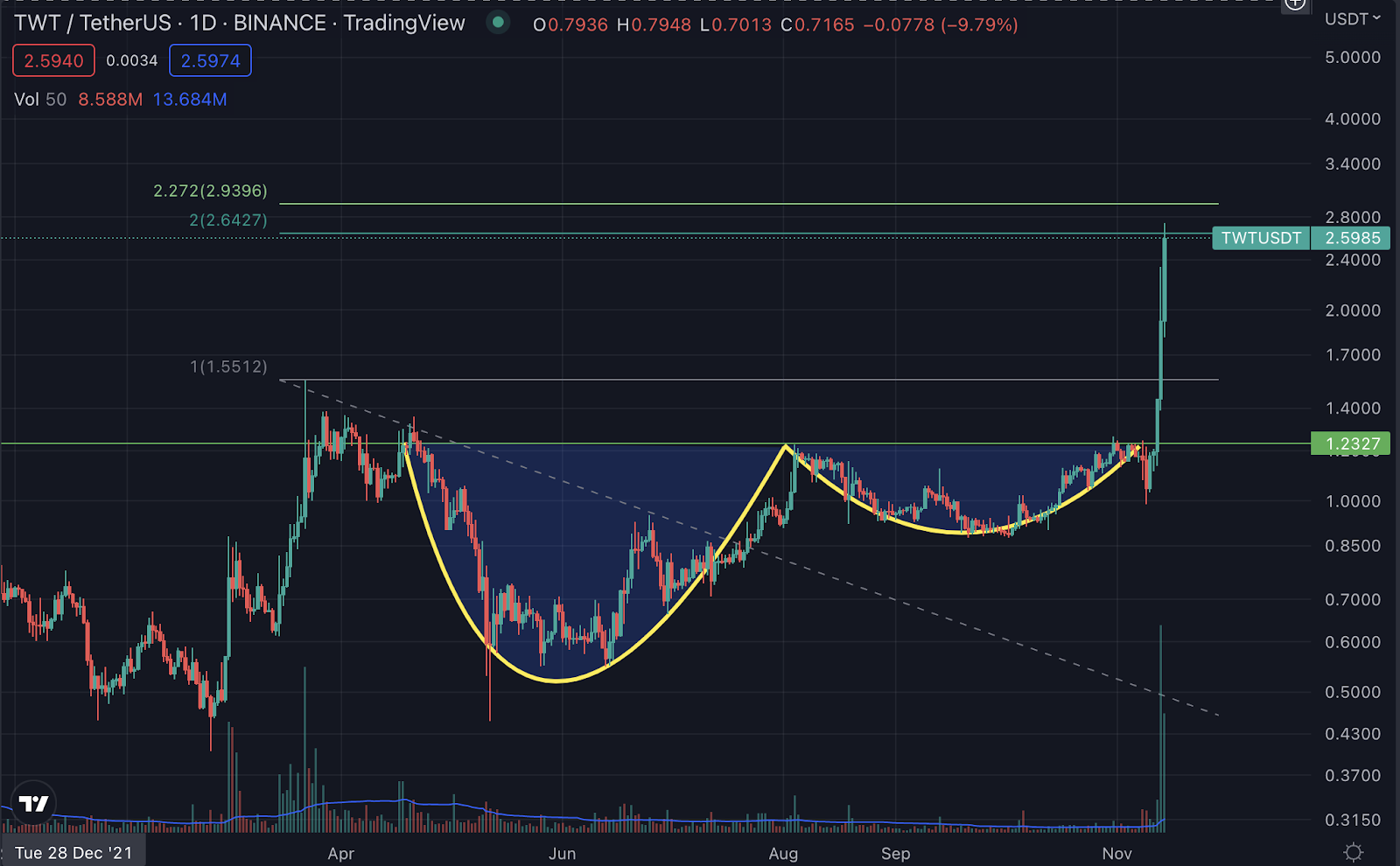 TWT formed a clear cup and handle pattern in the weekly timeframe before the breakout. The coin that has been pumping from Nov 10, when Binance announced not to pursue the FTX breakdown, finally breached the neckline at $1.2327 on Nov 12. It is trading at an all-time high now.