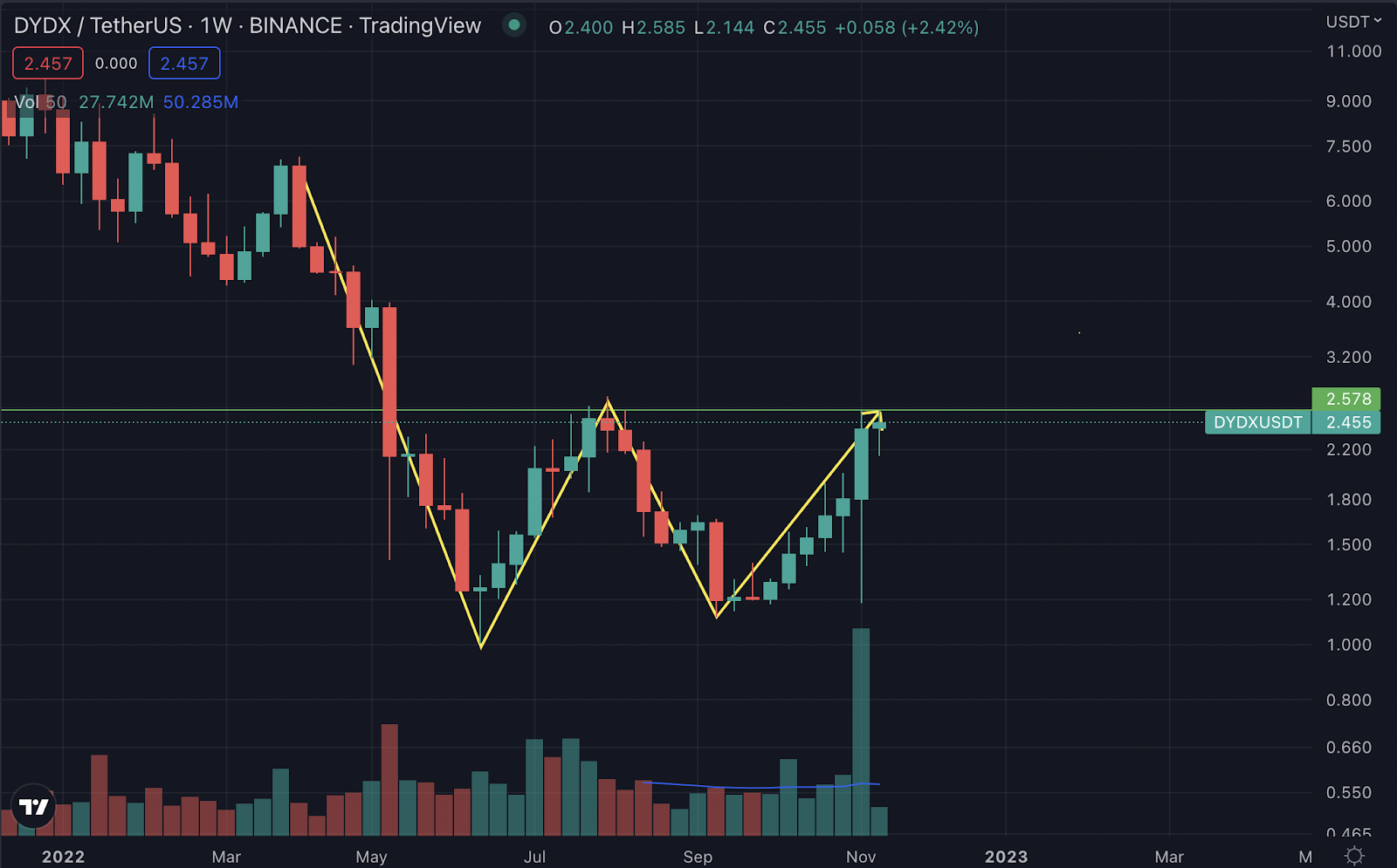 DYDX seems to form a solid double-bottom base. With the support of volume, a close above the neckline at $2.578 can send the price over the $5 level. However, the same neckline is a strong resistance as of now.