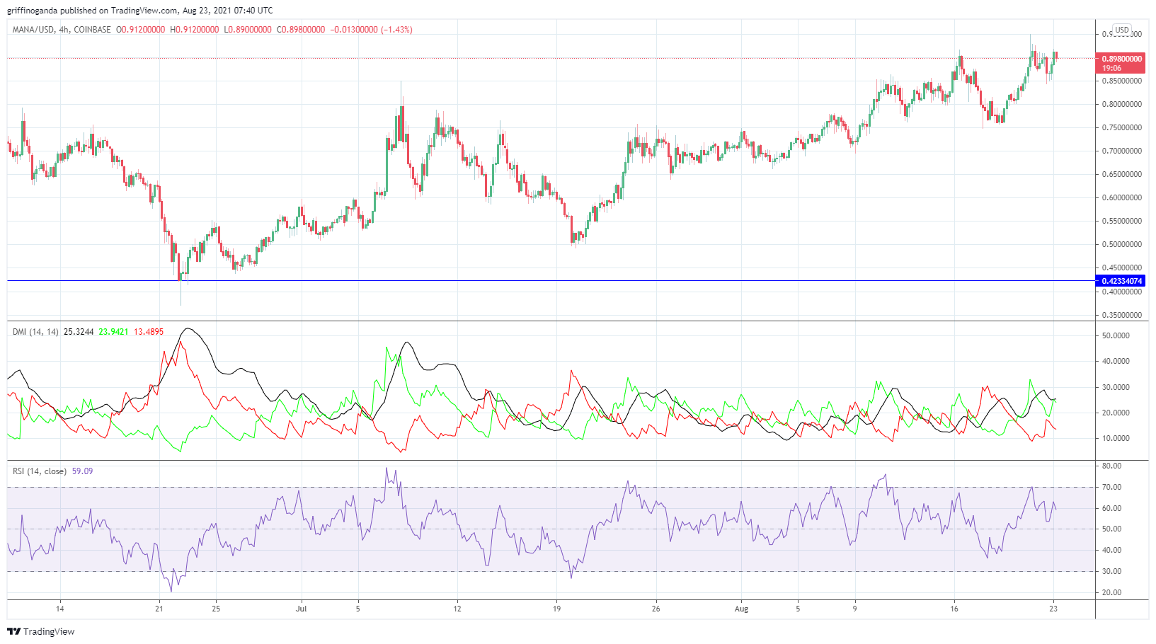 The RSI index trades currently at around 58.28; it remains in the mildly overbought zone. However, this figure is still neutral and does not show any divergence against MANA. The DMI is bullish; the +DMI is strongly dominant.