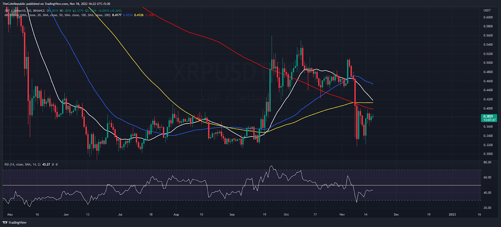 Against the USDT pair, XRP price is trading at $0.3833 mark at the time of writing. Although, price action forms lower-highs below the downsloping trendline. Buyers must break this resistance trendline to propel asset prices until the next resistance zone. Furthermore, the XRP coin belonging to the Bitcoin pair is in the green by 1.38% at 0.00002284 satoshis.