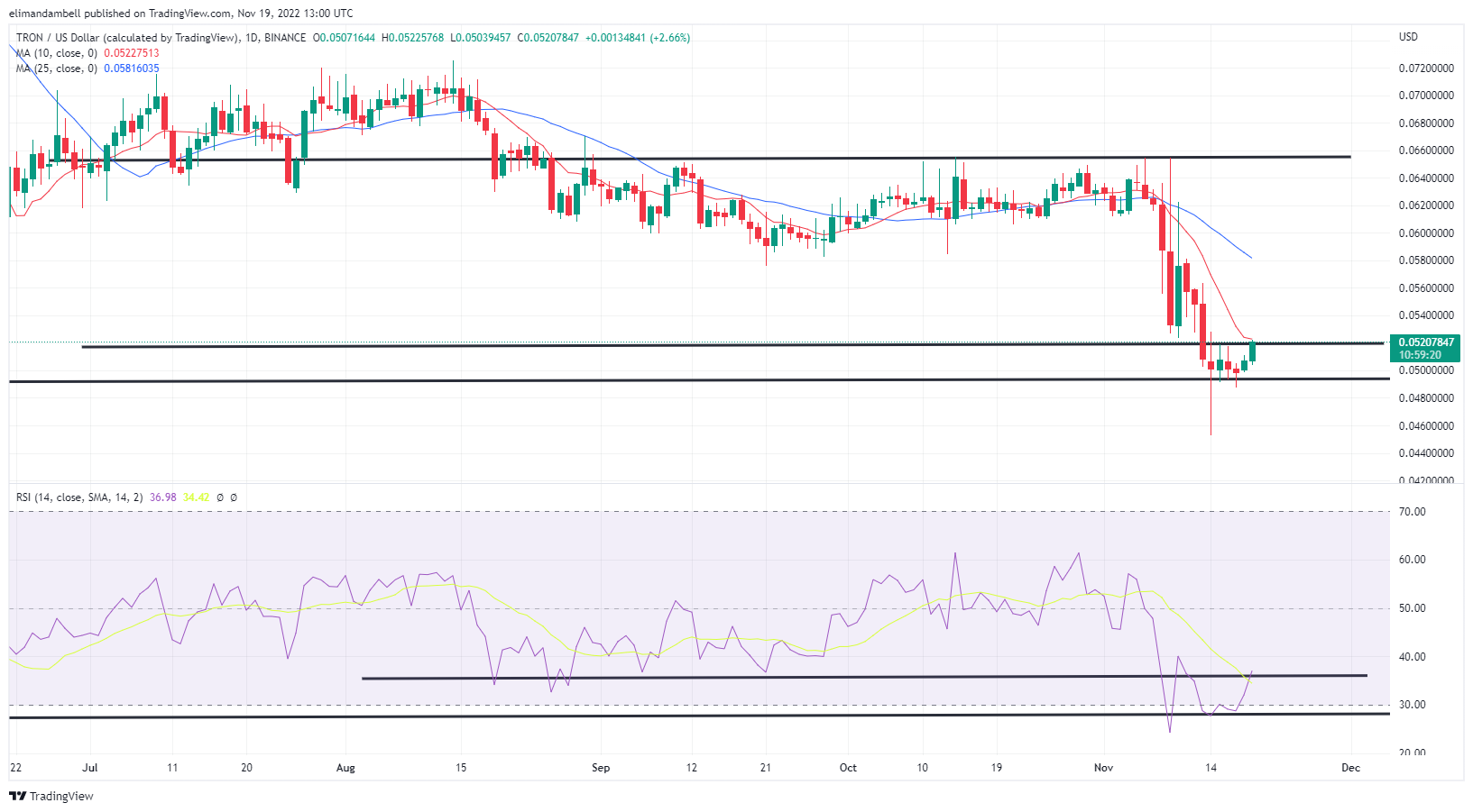 TRX/USD hit a peak of $0.05197 earlier in the day, which comes less than 24 hours after hitting a low of $0.05042.