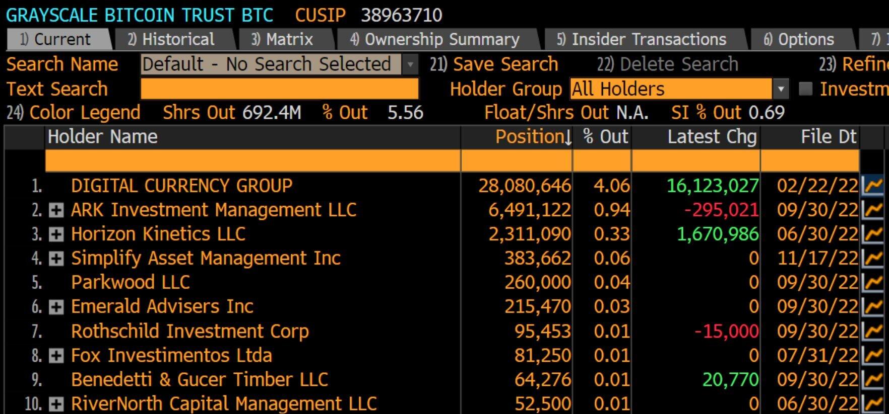 Data on a 13F form (a quarterly form filled out by fund managers) shows that institutions have been dropping GBTC during the last few quarters thanks to DCG’s buyback programs. This has made DCG the largest shareholder of the Trust.
