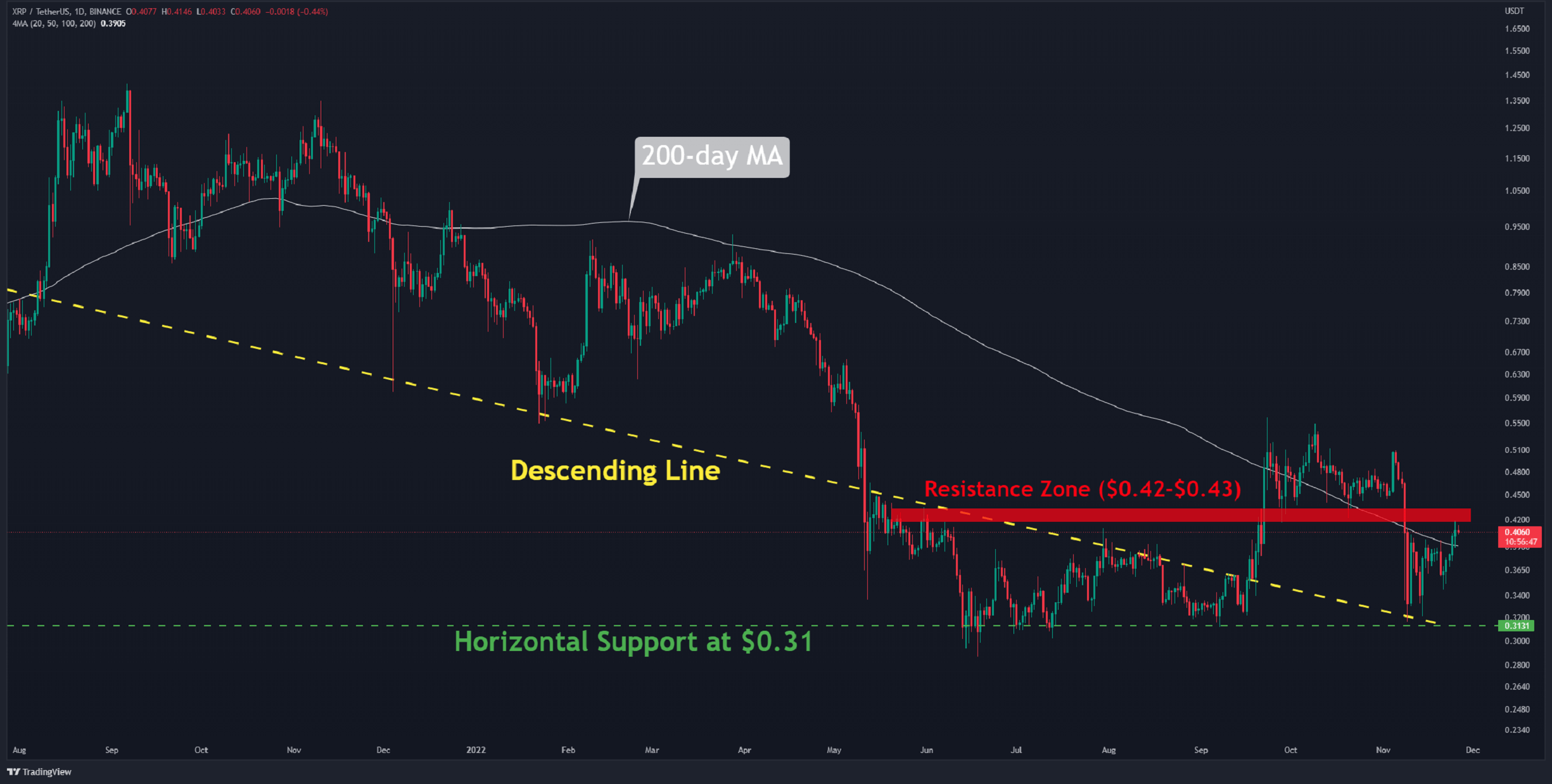 XRP managed to recapture the 200-day moving average line (in white) on the daily chart after struggling since mid-November. Technically, this pattern denotes a positive psychological momentum in the market.