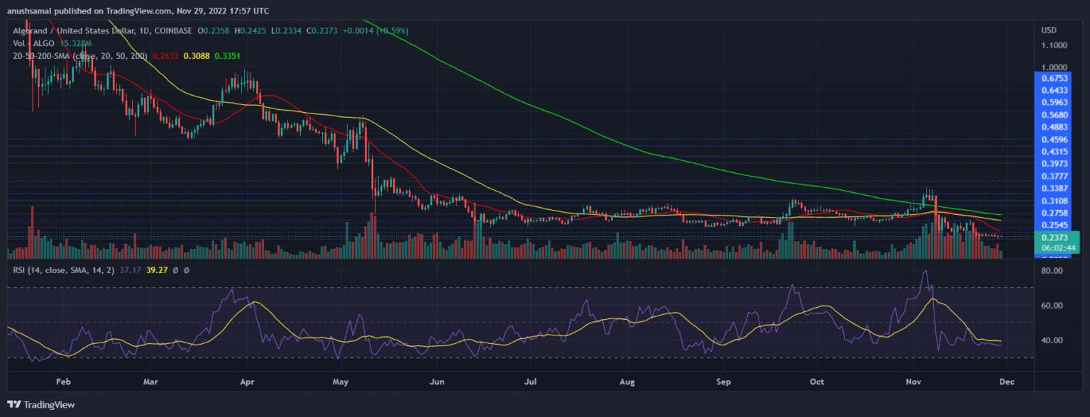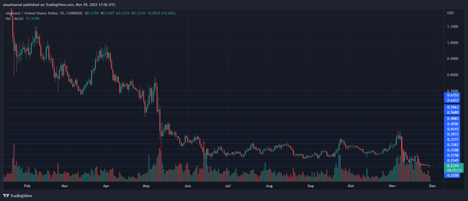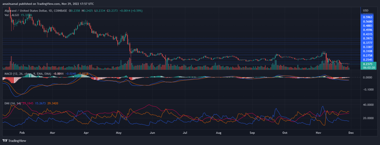Algorand price continues to pack negative price action throughout the month of November. The altcoin has depreciated by more than 40% since the beginning of this month. Over the last 24 hours, ALGO has just risen by 0.6% on its chart, emphasizing continued lateral price movement.