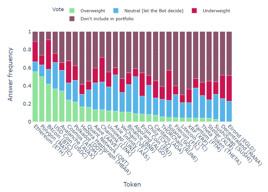 The bot’s latest data reveals that traders’ have a strong preference for Ethereum (ETH), with the majority of market participants voting to overweight their portfolios with ETH. Second place is Polygon (MATIC), the leading layer-2 ecoystem designed to help scale Ethereum. MATIC is followed by king crypto Bitcoin (BTC).