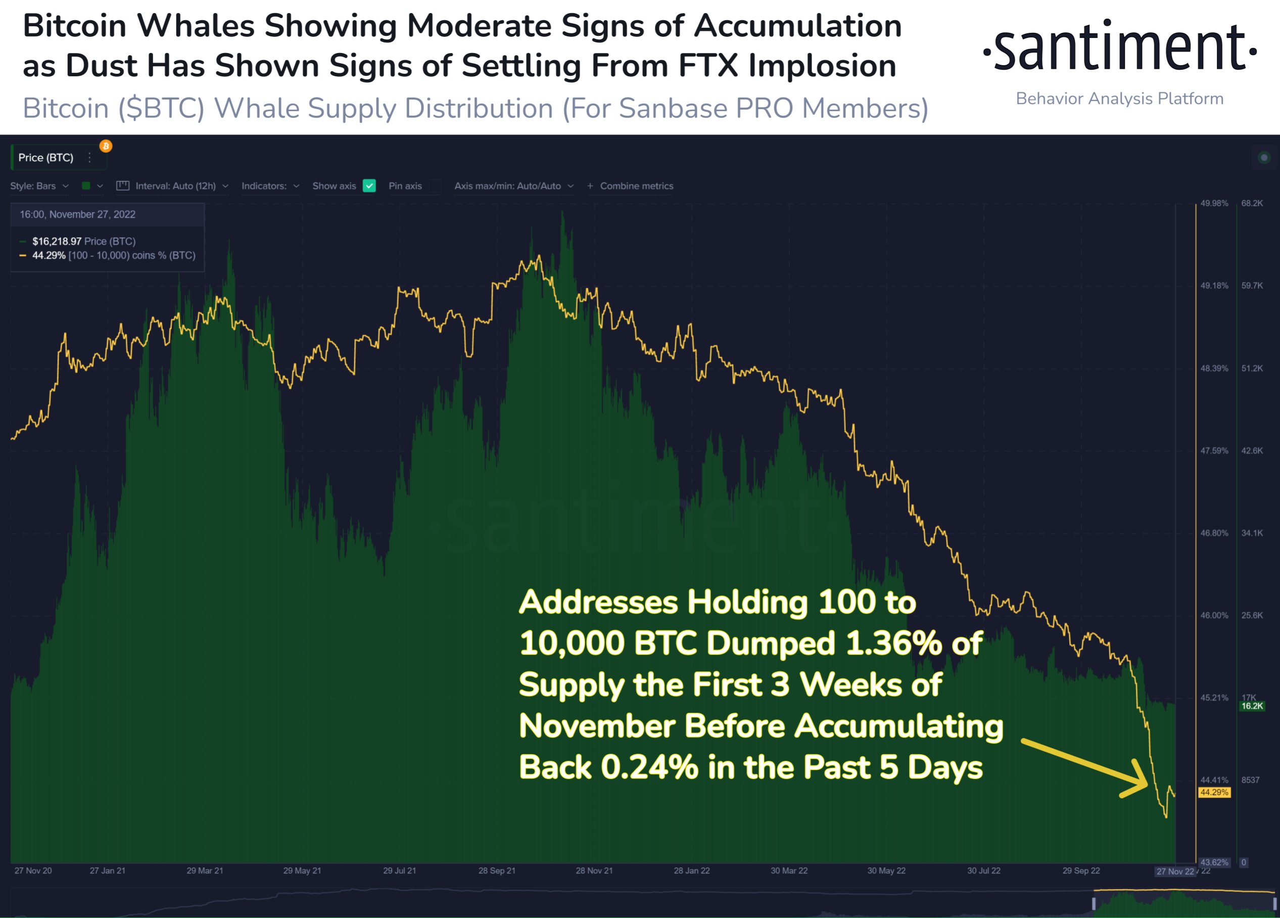 According to Santiment, whales have been dumping their cumulative holdings for 13 months, and addresses holding between 100 and 10,000 BTC sold off 1.36% of their supply across the first three weeks of November.