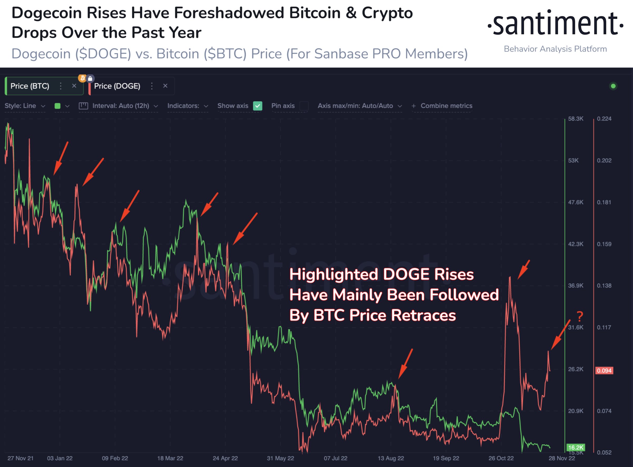 “When altcoin hype peaks, DOGE is commonly in the forefront. As this chart illustrates, major spikes in the memecoin can be useful to foreshadow upcoming Bitcoin drops.”