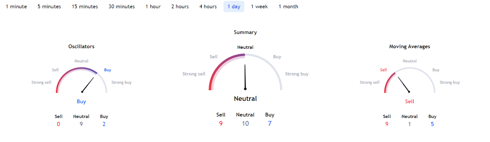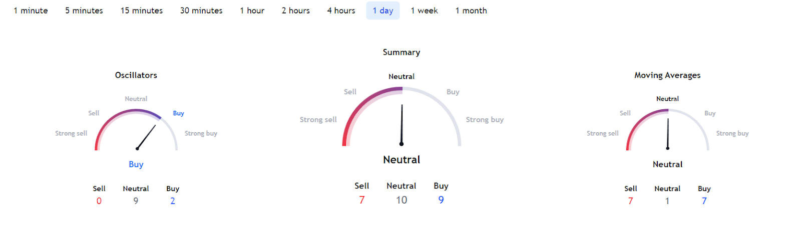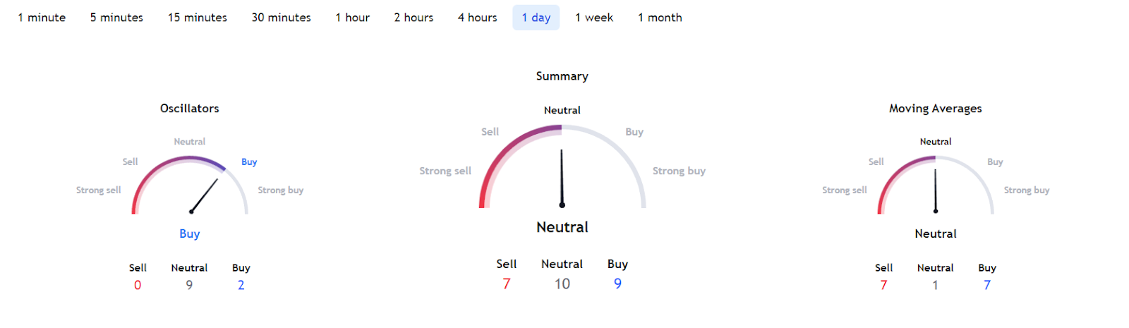 Like Bitcoin’s, technical indicators for Ethereum can also be summarized as ‘neutral’ at 10, as its moving averages gauge also points to ‘neutral’ at 1 (with both ‘sell’ and ‘buy’ at 7), but oscillators are in the ‘buy’ zone at 2.