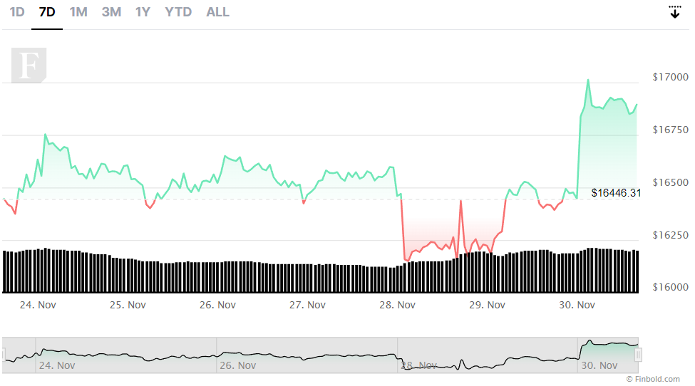 At press time, the maiden crypto is changing hands at the price of $16,844.60, up 2.45% over the previous 24 hours, as well as 2.37% during the week, minimizing its summed-up monthly losses of 17.27%.