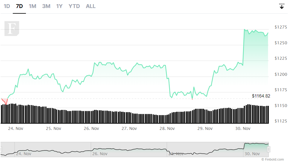 Currently, Ethereum is trading at the price of $1,266.08, recording a 4.44% gain on the day and 8.67% compared to the previous seven days, recovering from the 18.84% loss on its monthly chart.
