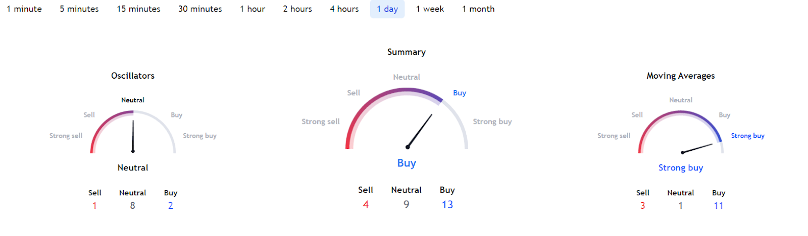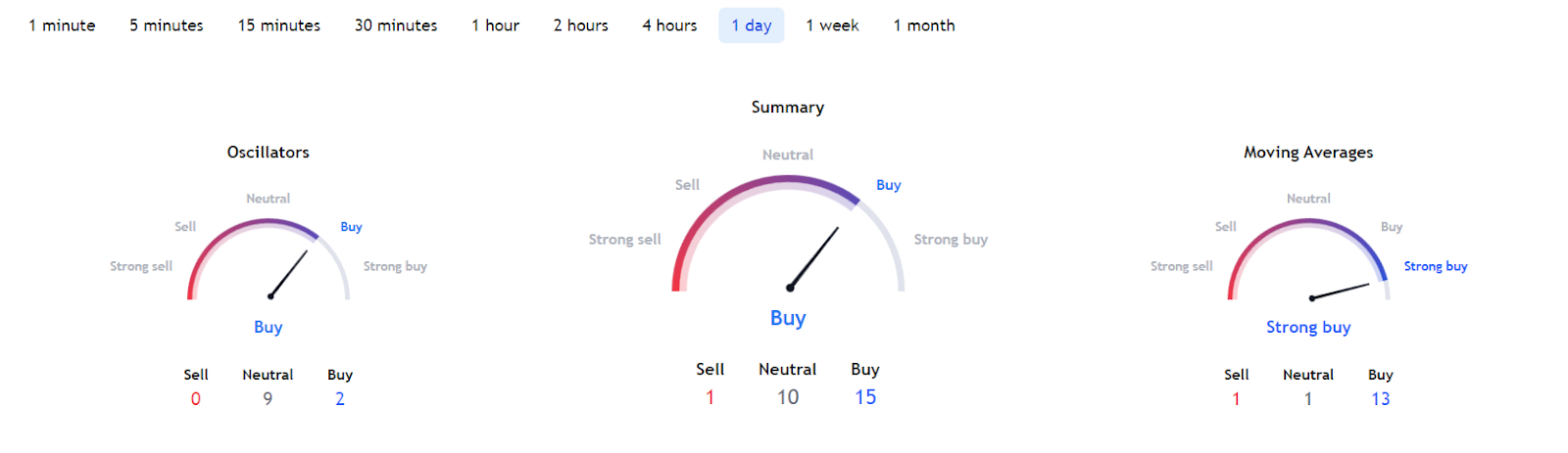 At the same time, technical indicators for Fantom are positive, with the 1-day summary firmly in the ‘buy’ area at 13, thanks to moving averages indicating a ‘strong buy’ at 11 and oscillators being in ‘neutral’ at 8.