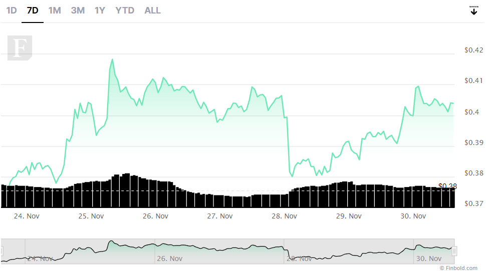 Despite the announcement that crypto exchange Coinbase is ending the wallet support for it, XRP is recording an increase of 2.42% on the day and 6.97% across the previous week, currently trading at $0.4009, which alleviates its monthly decline of 11.16%.