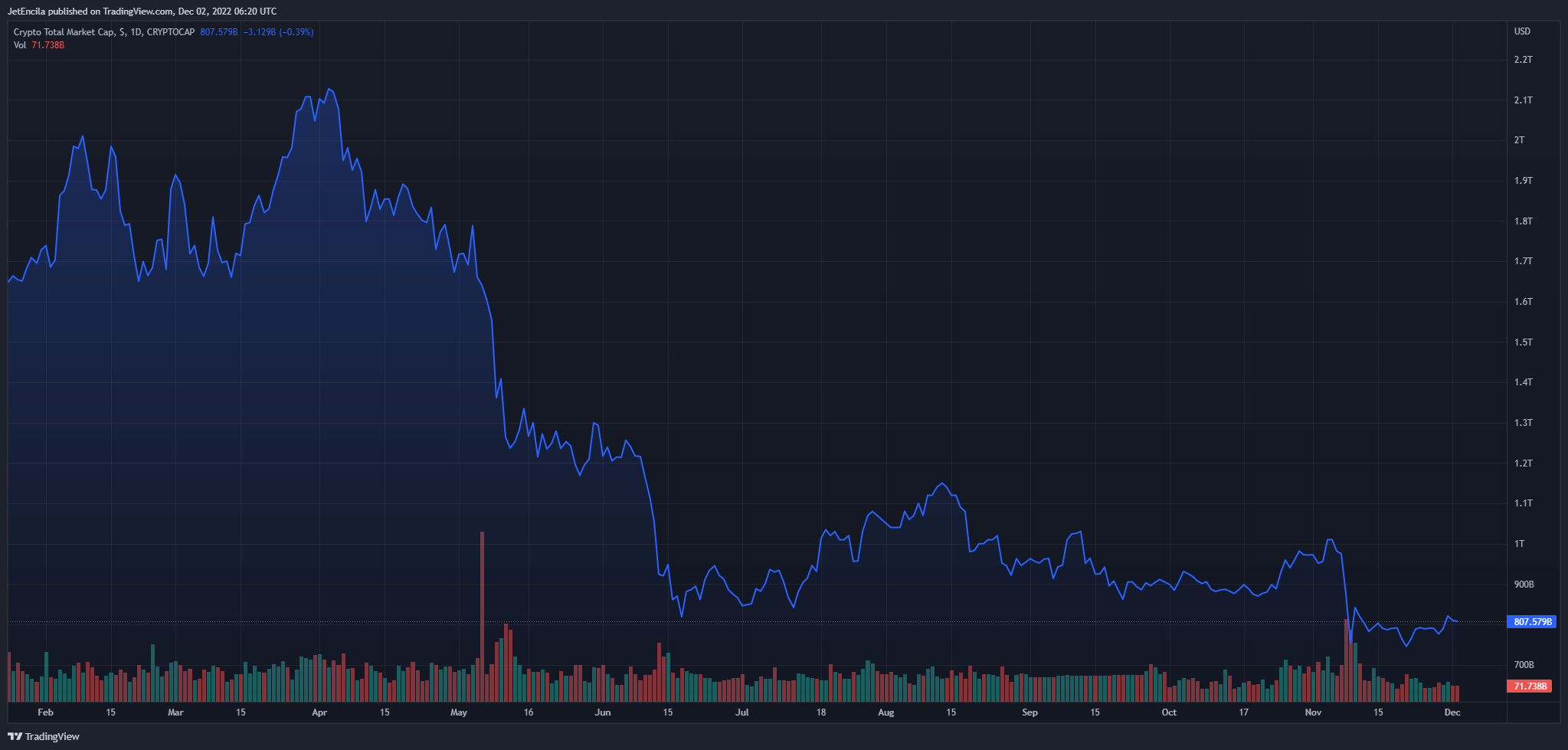 Crypto total market cap at $808 billion on the daily chart | Featured image from Crypto News, Chart: TradingView.com