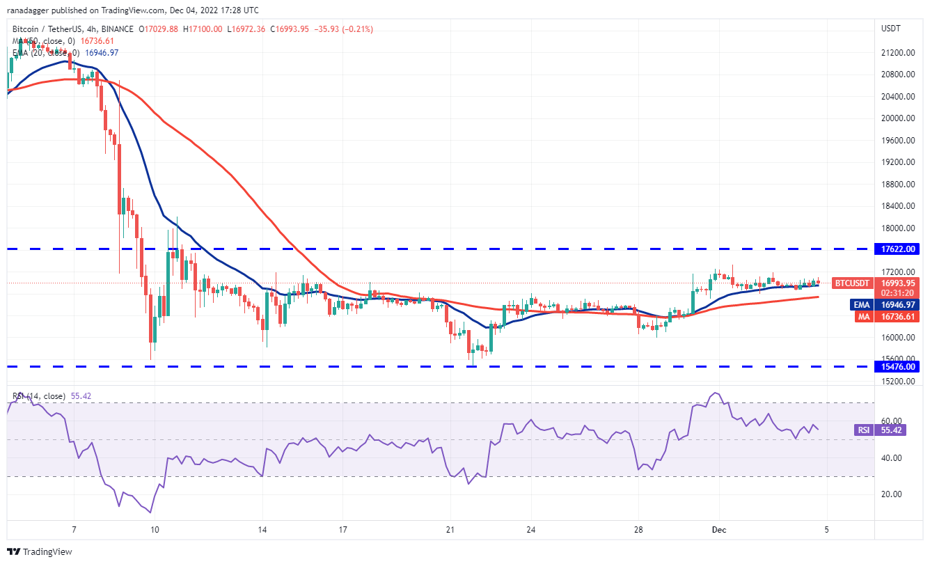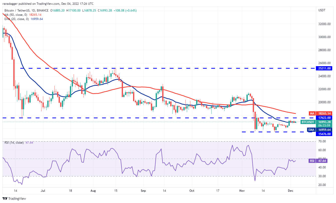 Bitcoin has been trading near the 20-day exponential moving average ($16,963) for the past three days. This suggests a tough battle between the bulls and the bears to gain supremacy.