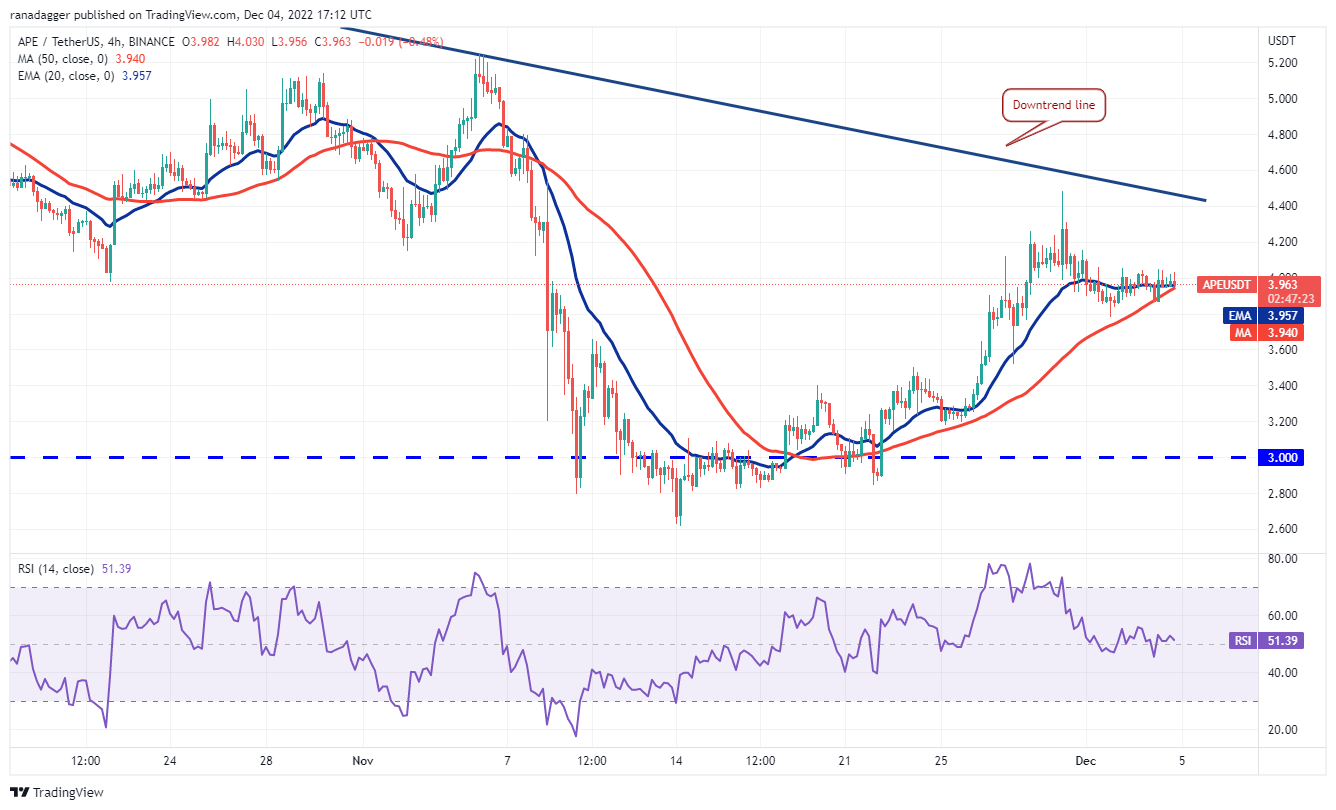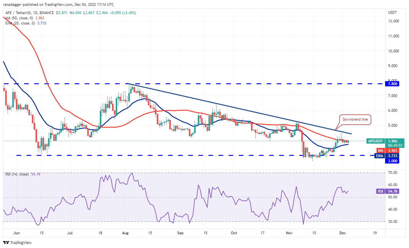 ApeCoin (APE) turned down from the downtrend line on Nov. 30 but the bulls have not allowed the price to break below the 20-day EMA ($3.73). This is a positive sign as it signals demand at lower levels.