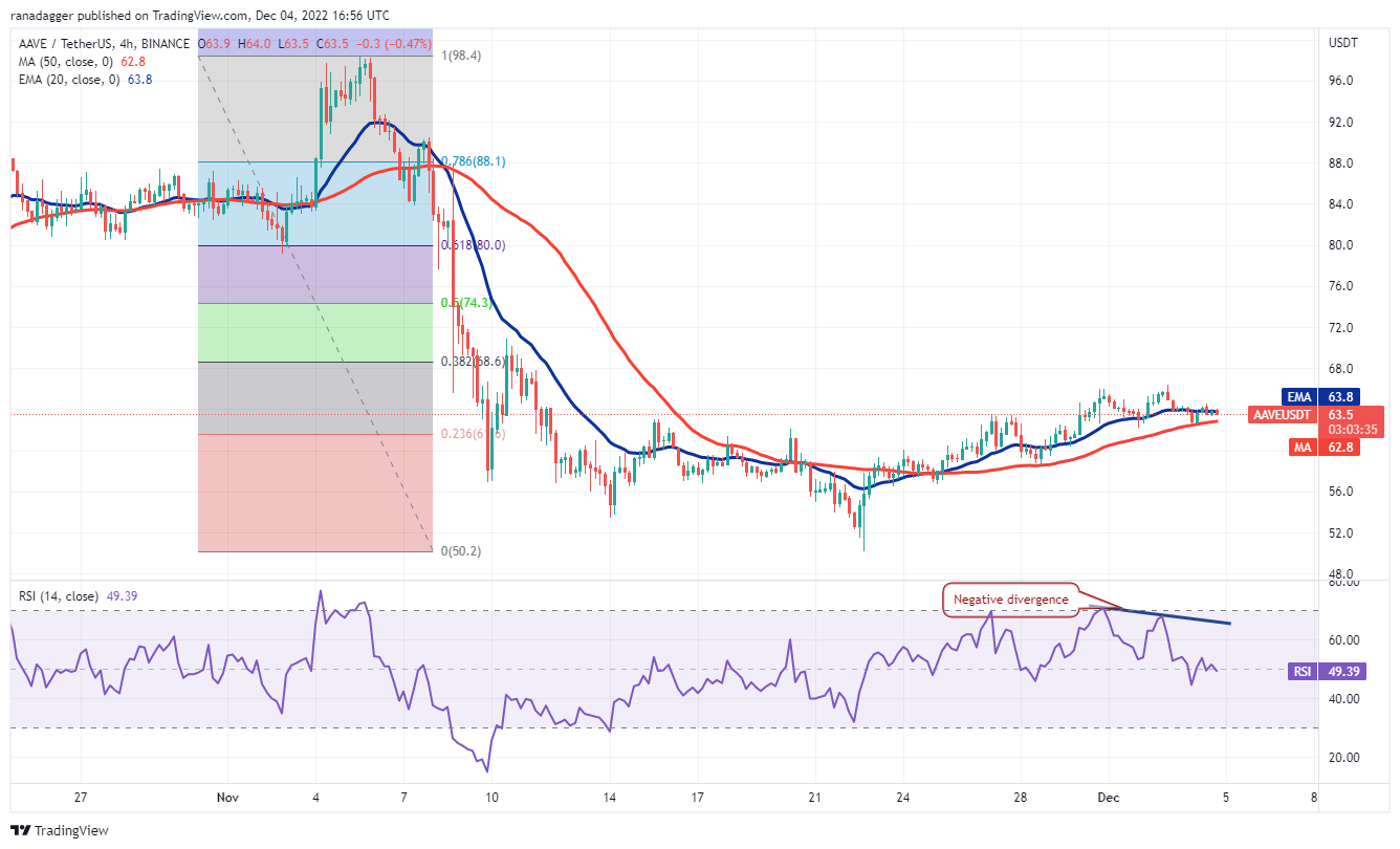 The 20-day EMA has flattened out and the RSI is near the midpoint, indicating that the bears may be losing their grip. If buyers thrust the price above $68, the AAVE/USDT pair could rally to the 50-day SMA ($71) and thereafter to the 61.8% retracement level at $80.