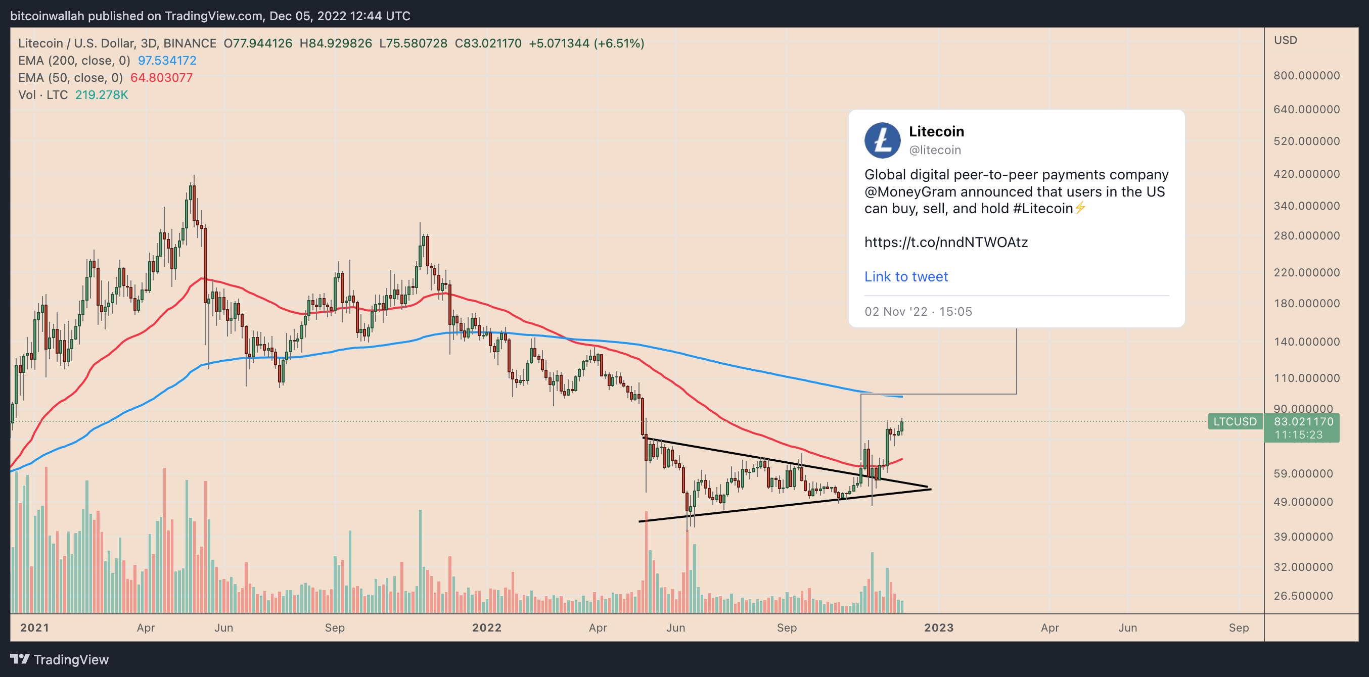 Litecoin's symmetrical triangle breakout move started in late October. It coincided with MoneyGram's announcement that it would enable users to purchase, store, and use LTC alongside Bitcoin (BTC) and Ether (ETH) for payments.