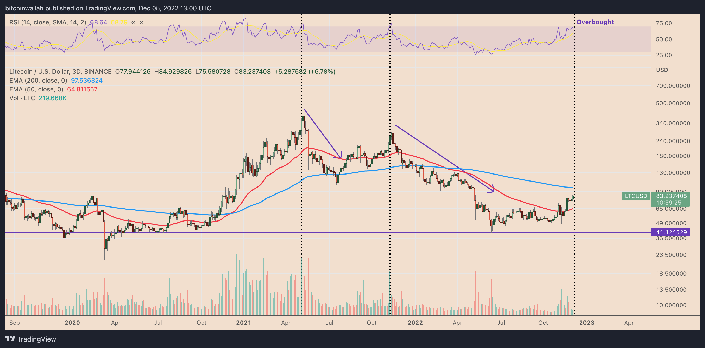 The LTC breakout lost momentum due to the FTX collapse in the first week of November and its negative impact on the broader crypto market. But, Litecoin resumed its upward trend amid speculations about its reward halving in the summer of 2023.