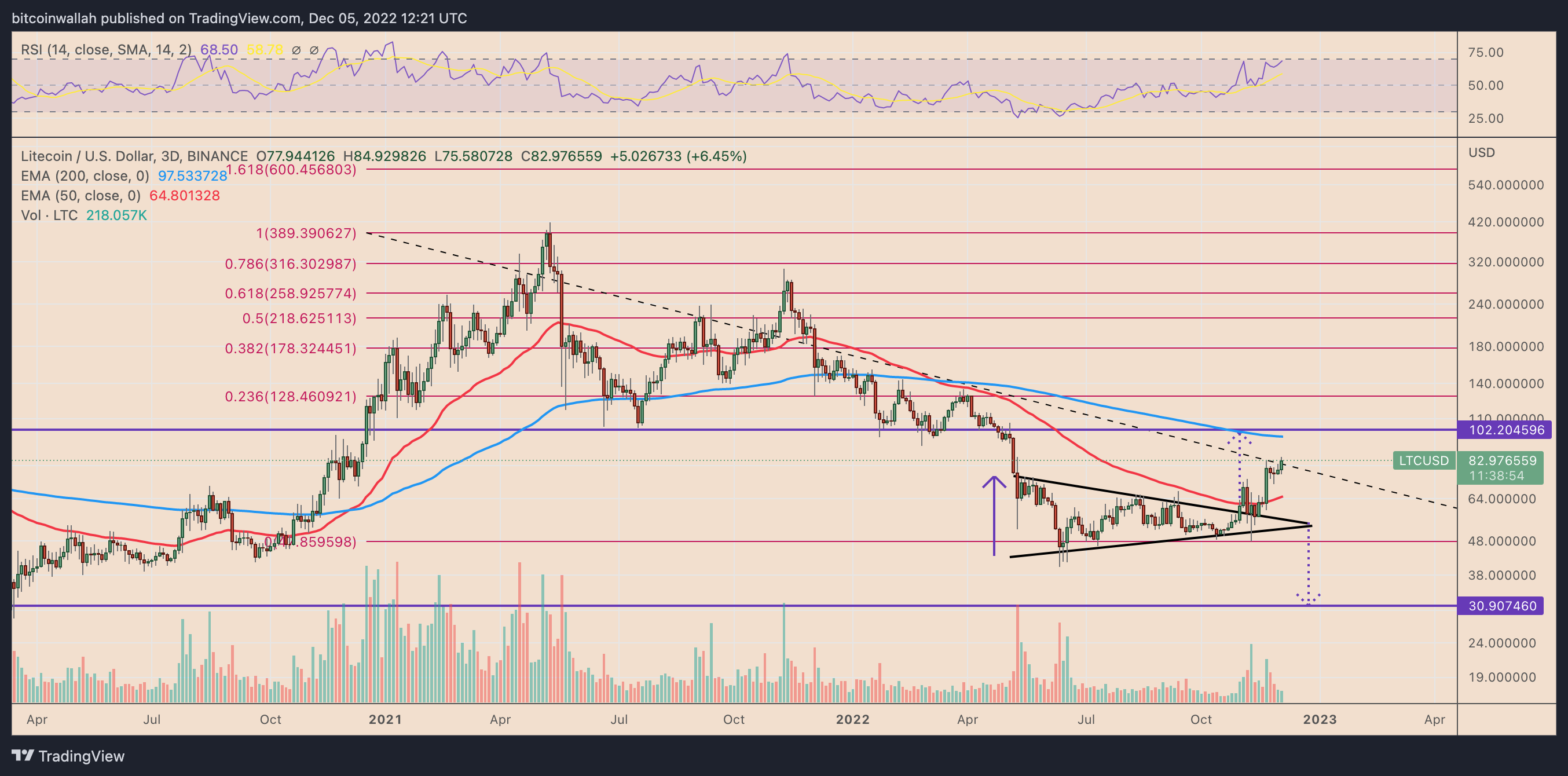 Litecoin followed up with its symmetrical triangle reversal move decisively and now eyes a run-up toward $100, or another 20% by December 2022.