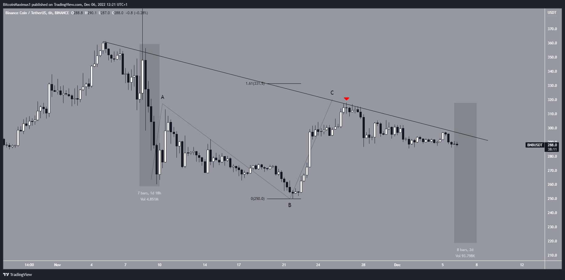 The short-term trend is considered bearish as long as the line is in place. If both portions of the BNB decrease have the same height (highlighted), the price could fall to $220.
