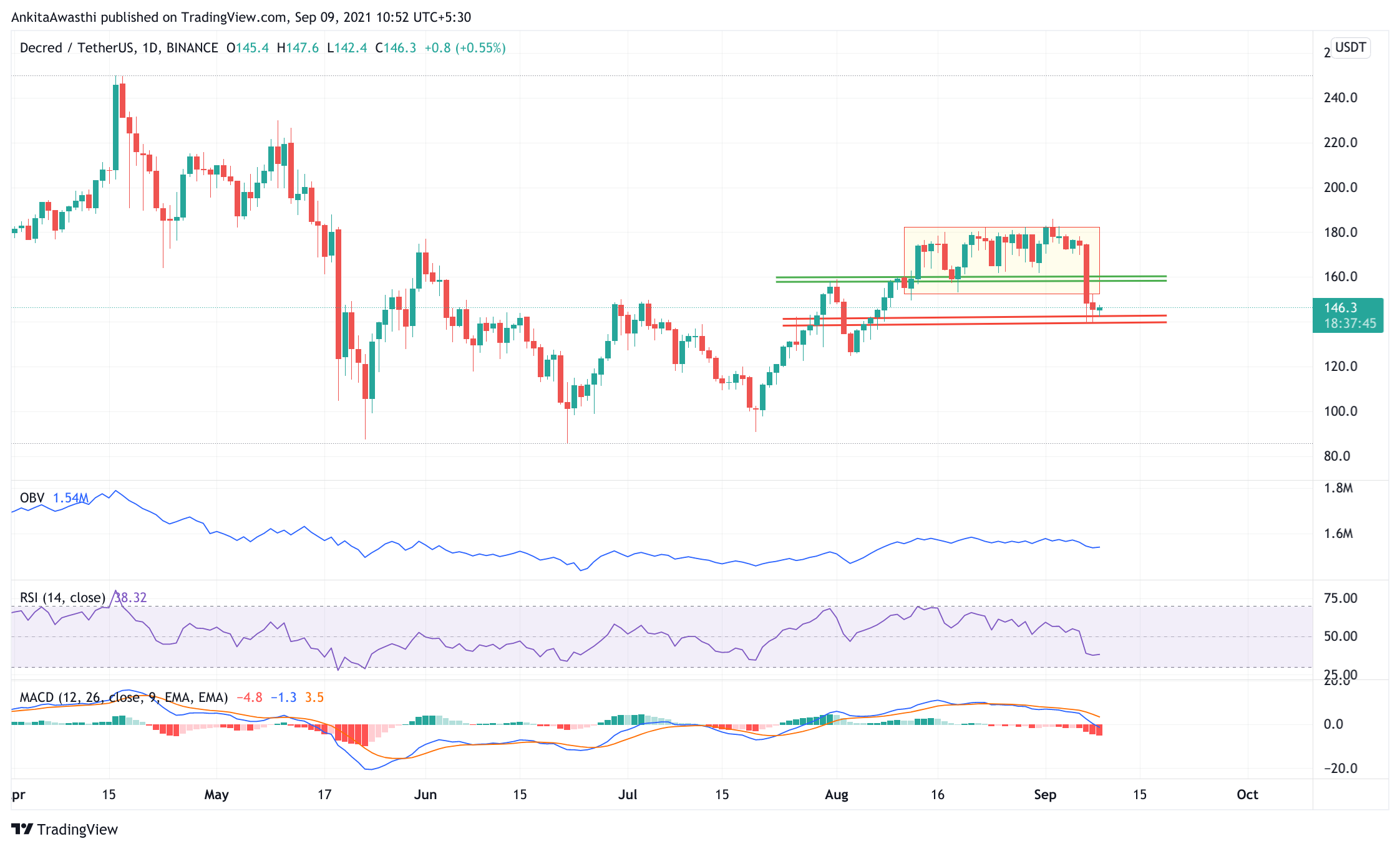 Currently, DCR is trading at $145.99. The price is approximately 3.15% down from the day’s opening price. Thus, it seems like bears have taken control of the market. Moreover, the $142 level has acted as strong support. Any breakdown from this level will confirm the bear trend.