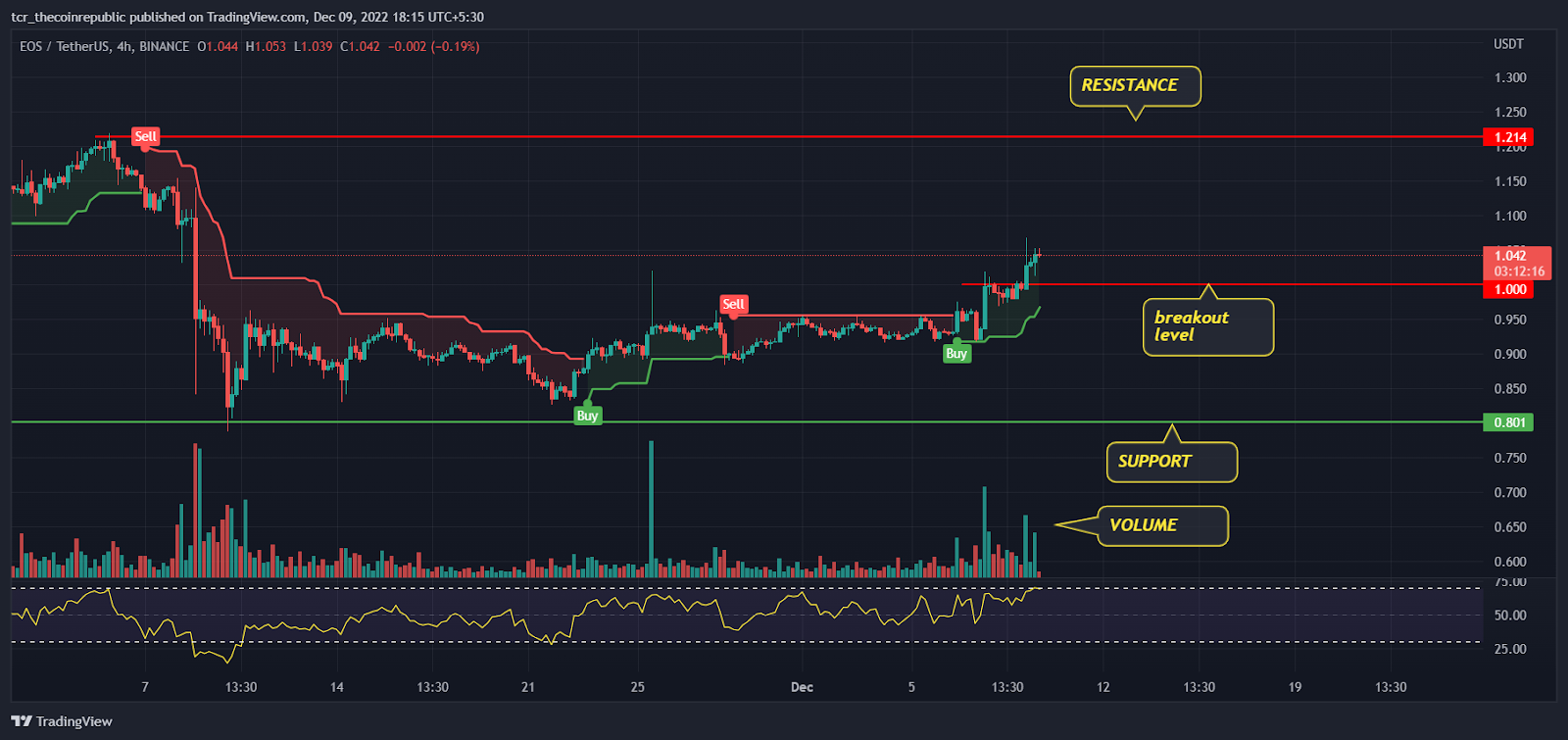 On a lower time frame, The supertrend indicator had generated a buy signal indicating short term price reversal. Prices had breakout $1 resistance with a deep bullish candle which will now act as an immediate support for coming days. As of now prices seems like picking up the momentum and traders and investors may look for buying opportunity for the target of $1.214 followed by next $1.484 by keeping $0.800 SL