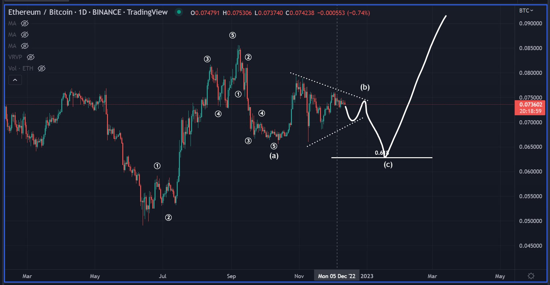 Smart Contracter relies on the Elliott Wave theory, a technical analysis approach that tries to predict future price action by following crowd psychology that tends to manifest in waves. According to the analyst’s chart, he sees ETH/BTC surging above 0.09 BTC ($1,544) by March 2023, a price level last witnessed in January 2018.