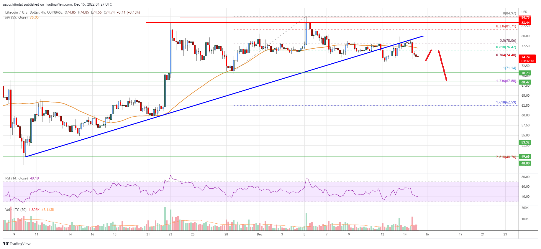 Looking at the chart, litecoin price is clearly trading below $80 and the 55 simple moving average (4-hours). Overall, the price could start a fresh increase if it stays above the $68.50 support zone.