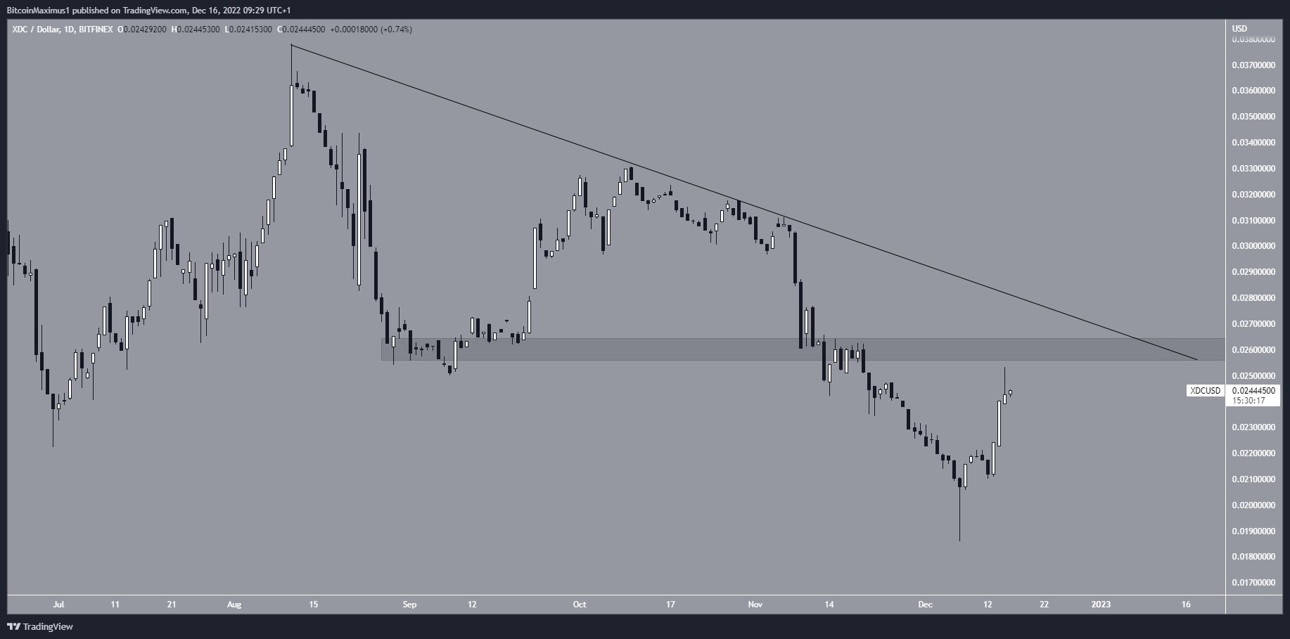 XDC has decreased below a descending resistance line since Aug. 11. The downward movement led to a low of $0.018 on Dec. 7. The price has been moving upward since and is approaching the descending resistance line.