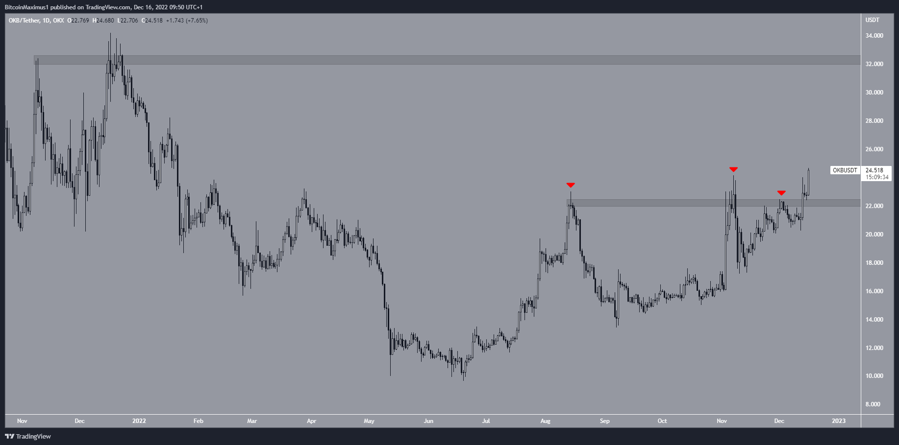Out of the five altcoins analyzed, OKB is the one that has increased the most relative to its yearly lows. OKB price has been moving upward since June. After three unsuccessful attempts (red icons), it broke out above the $22.50 resistance area on Dec. 13. It has been increasing since and reached a high of $24.60 on Dec. 16. This is the highest price since March 2022.
