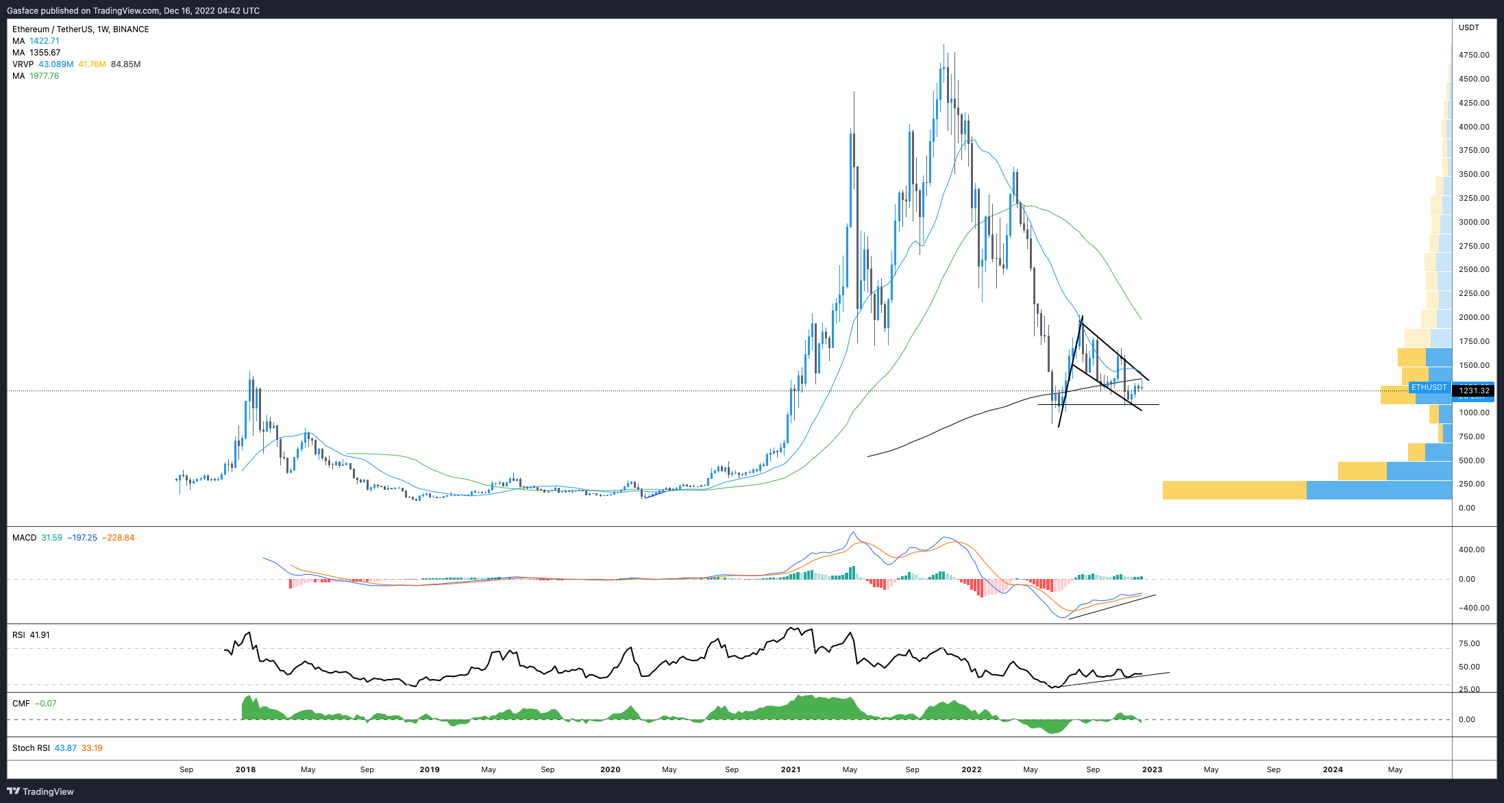 On the weekly timeframe, Bitcoin is still bouncing around in a falling wedge, a classic technical analysis pattern that tends to lean bullish. The price is doing pretty much what one would expect the price to do within the framework of technical analysis.