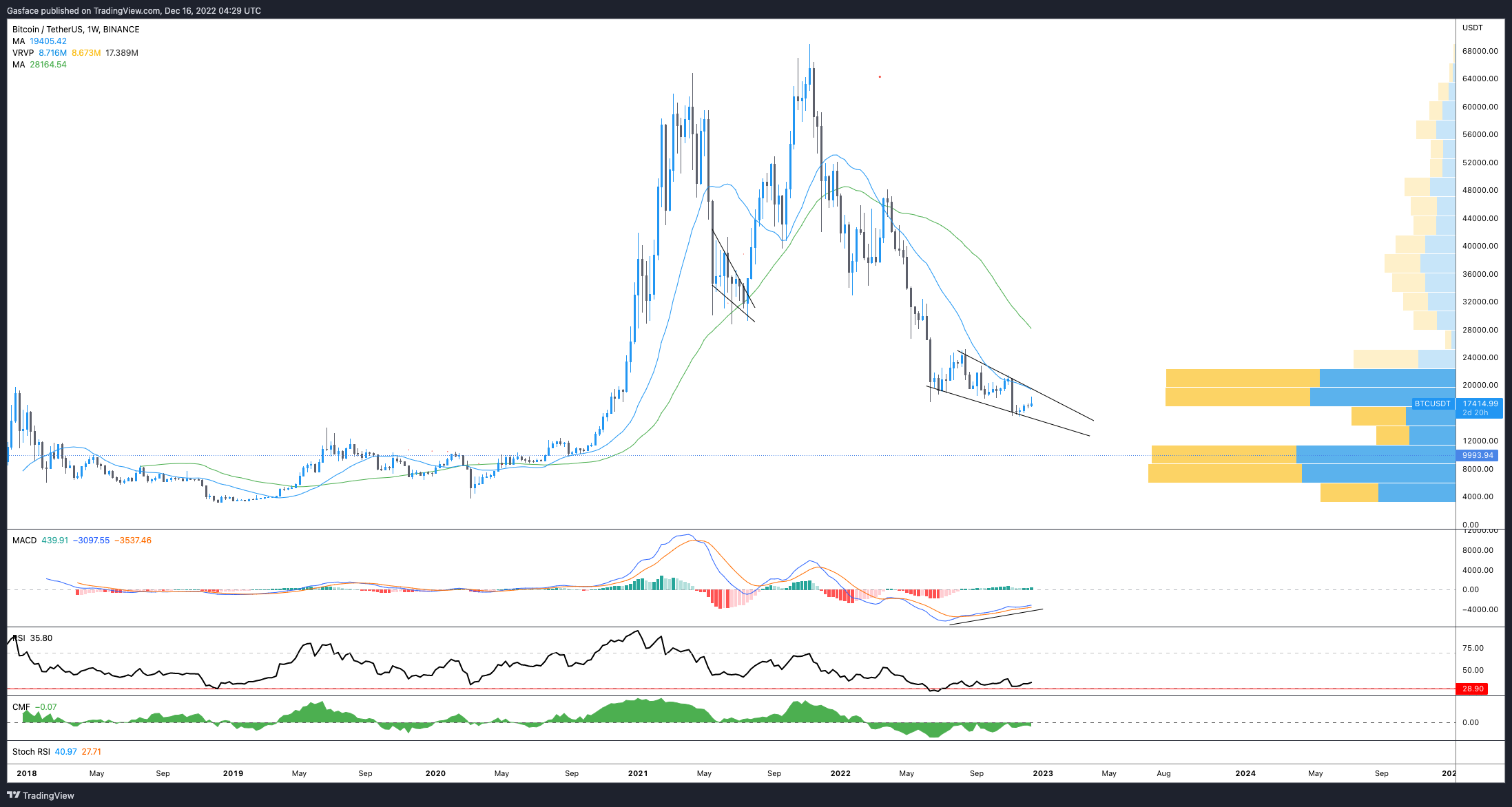 There’s expected resistance at the 20-MA, which is lined up with the descending trendline. The volume profile metric shows a bulk of activity in the $18,000–$22,500 range, and the lower arm of the falling wedge has so far functioned as support.