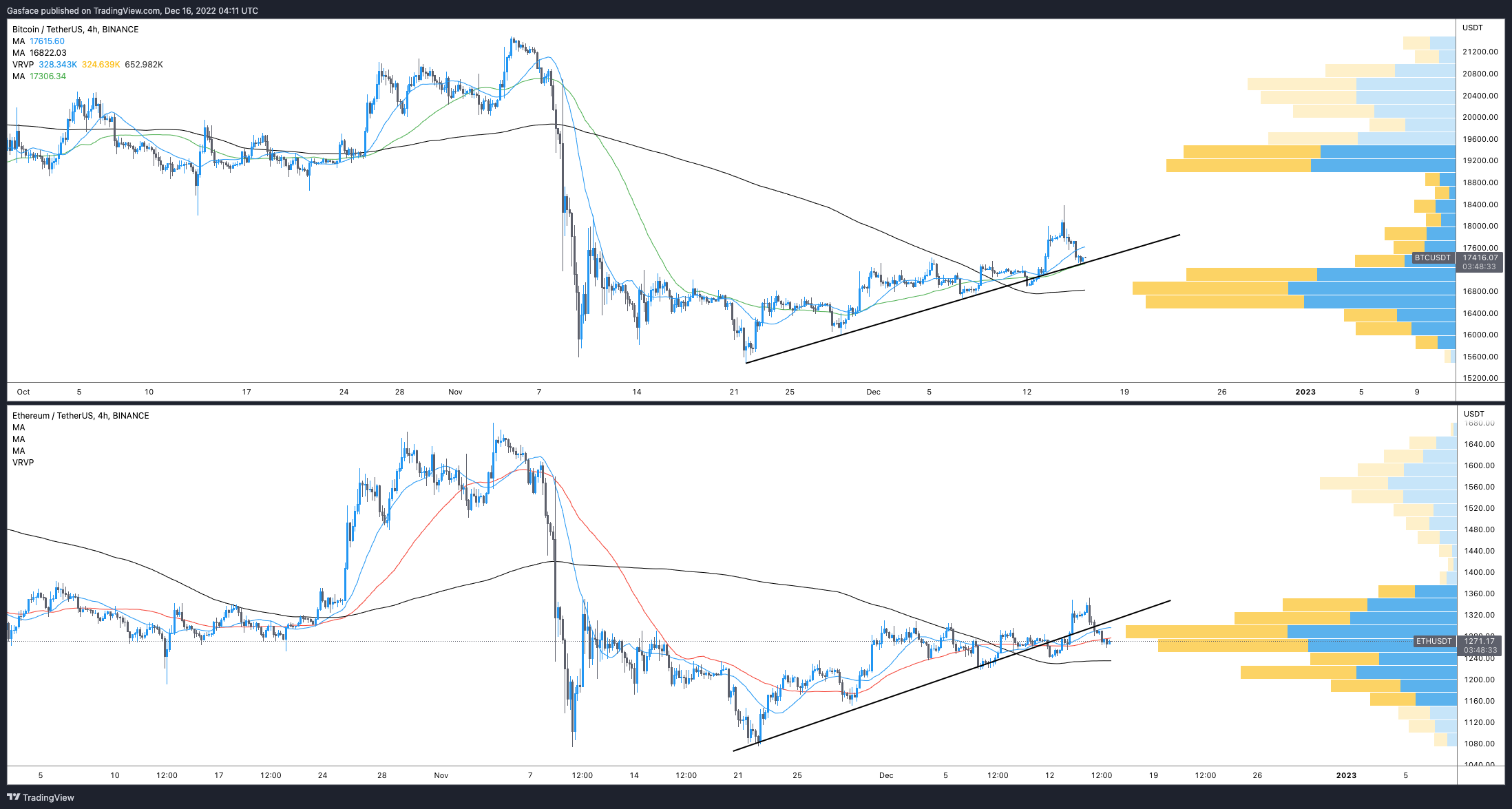 As the charts below show, Bitcoin (BTC) and Ether (ETH) reversed course right as Powell began his presser on Dec. 14.