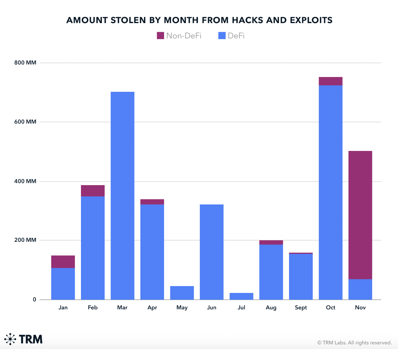 The chart shows the dollar amount stolen/swindled through hacks and exploits from January to November.