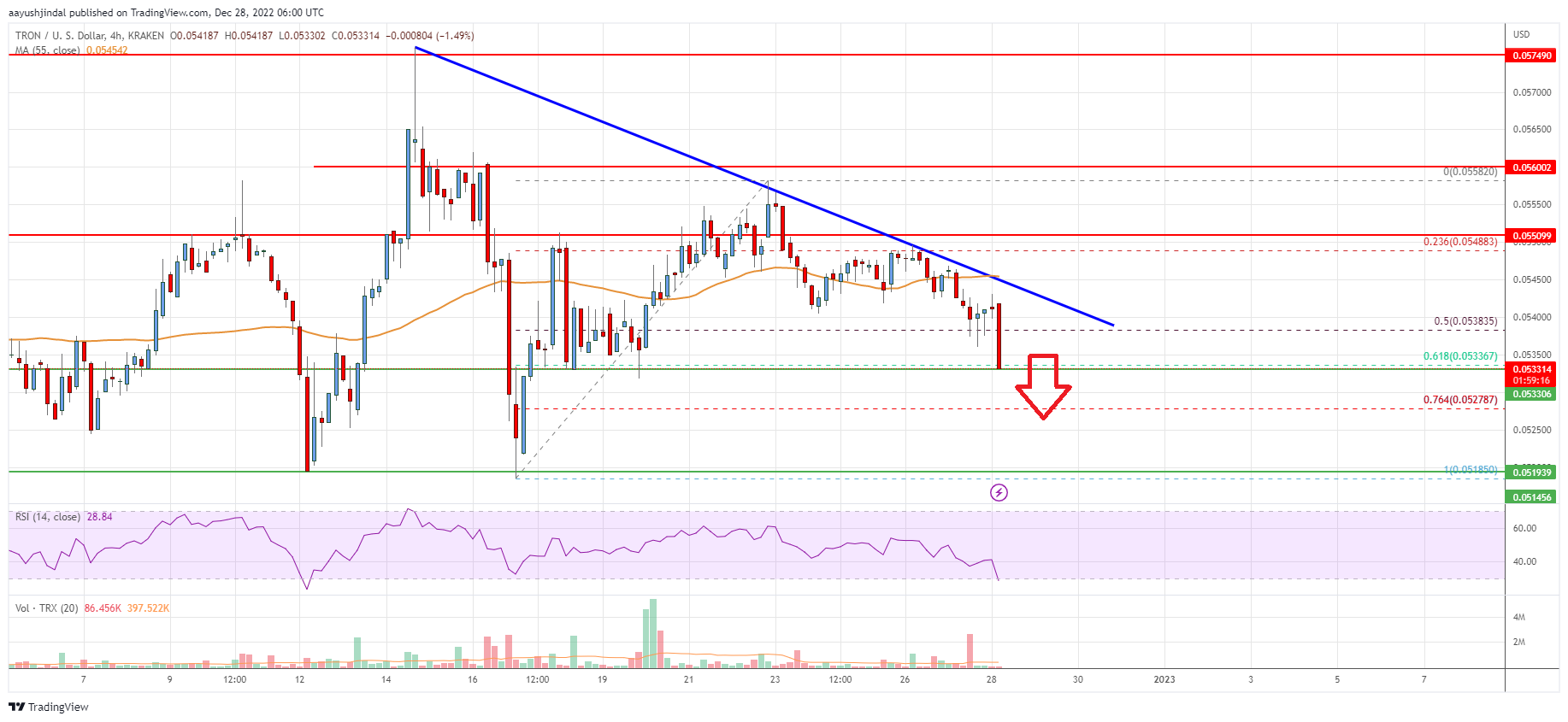 TRON price started a fresh decline below the $0.0550 against the US Dollar, similar bitcoin. TRX price could accelerate lower if there is a move below $0.0533.