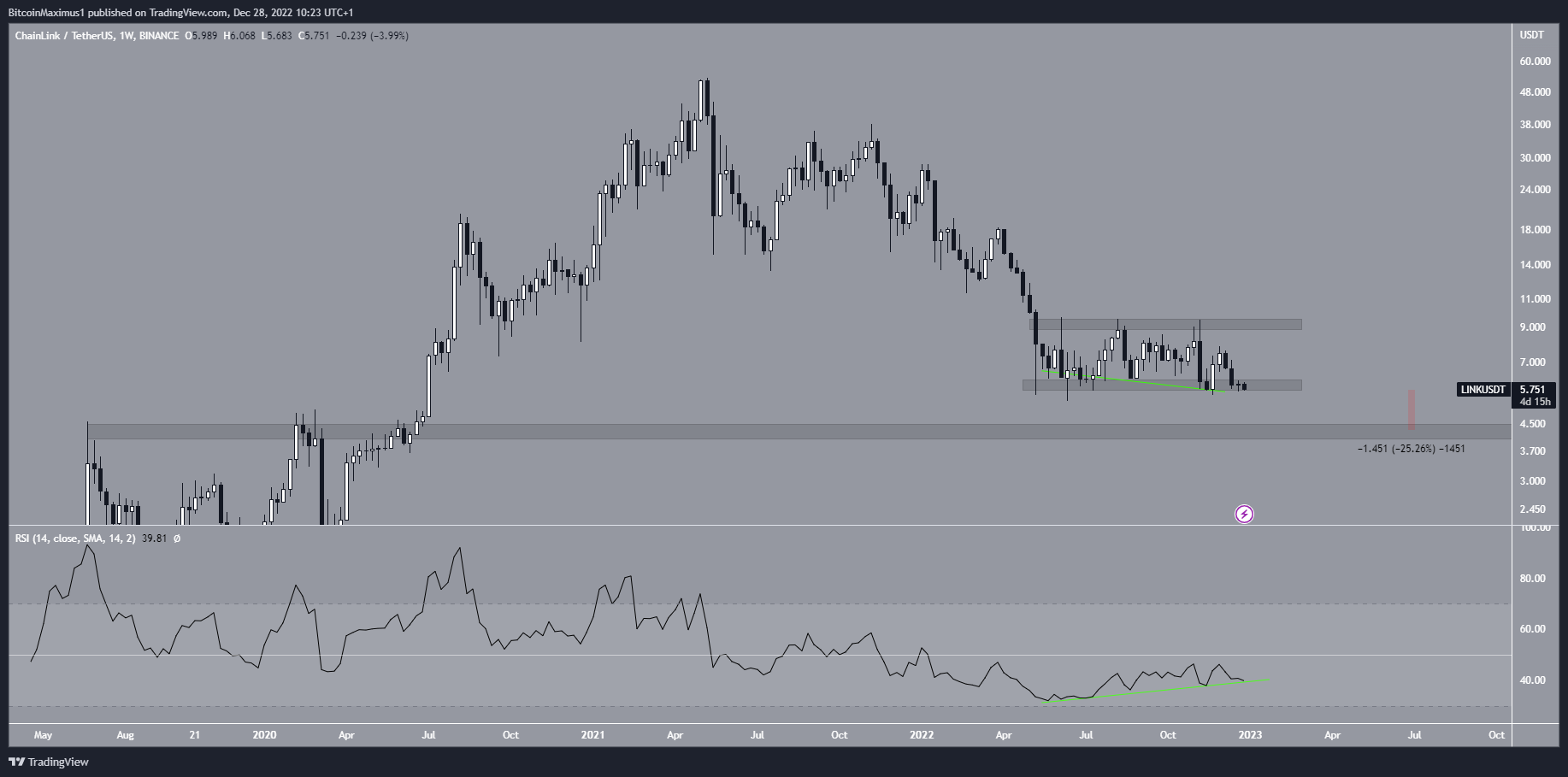 Since then, the LINK price has hovered above the $5.80 horizontal support area. During this time, the weekly RSI generated a bullish divergence (green line), something that often precedes upward movements. However, both the trendline of the divergence and the $6 horizontal support area are at risk of breaking down.