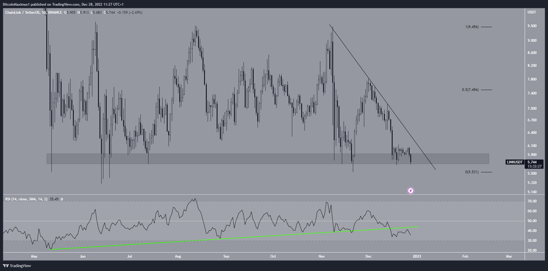 Moreover, the LINK price is following a descending resistance line that has been in place since the beginning of November. The line could reject the price if a bounce occurs. In case of a breakout, it is possible that LINK will reach $7.50, the 0.5 Fib retracement resistance level, and a horizontal resistance area.