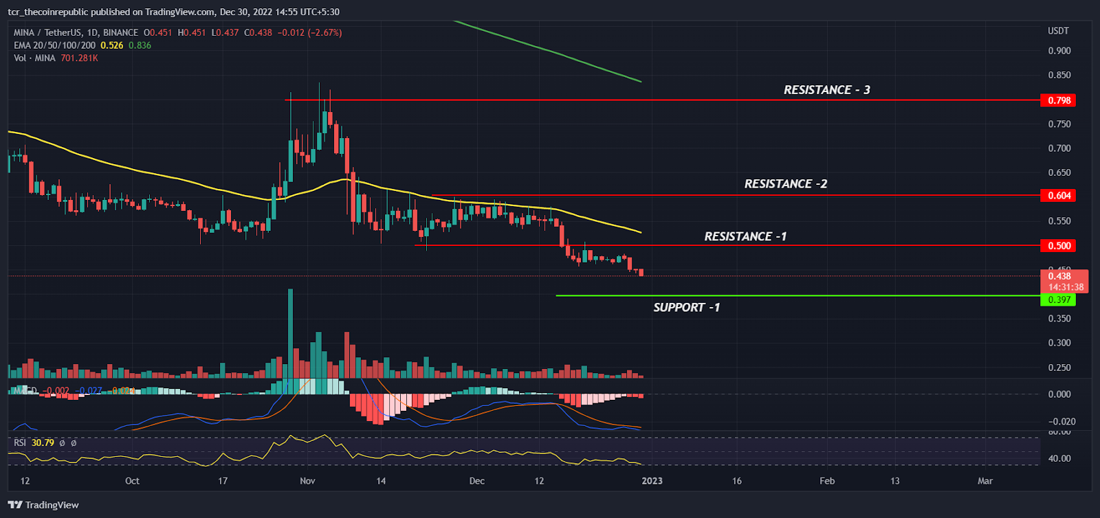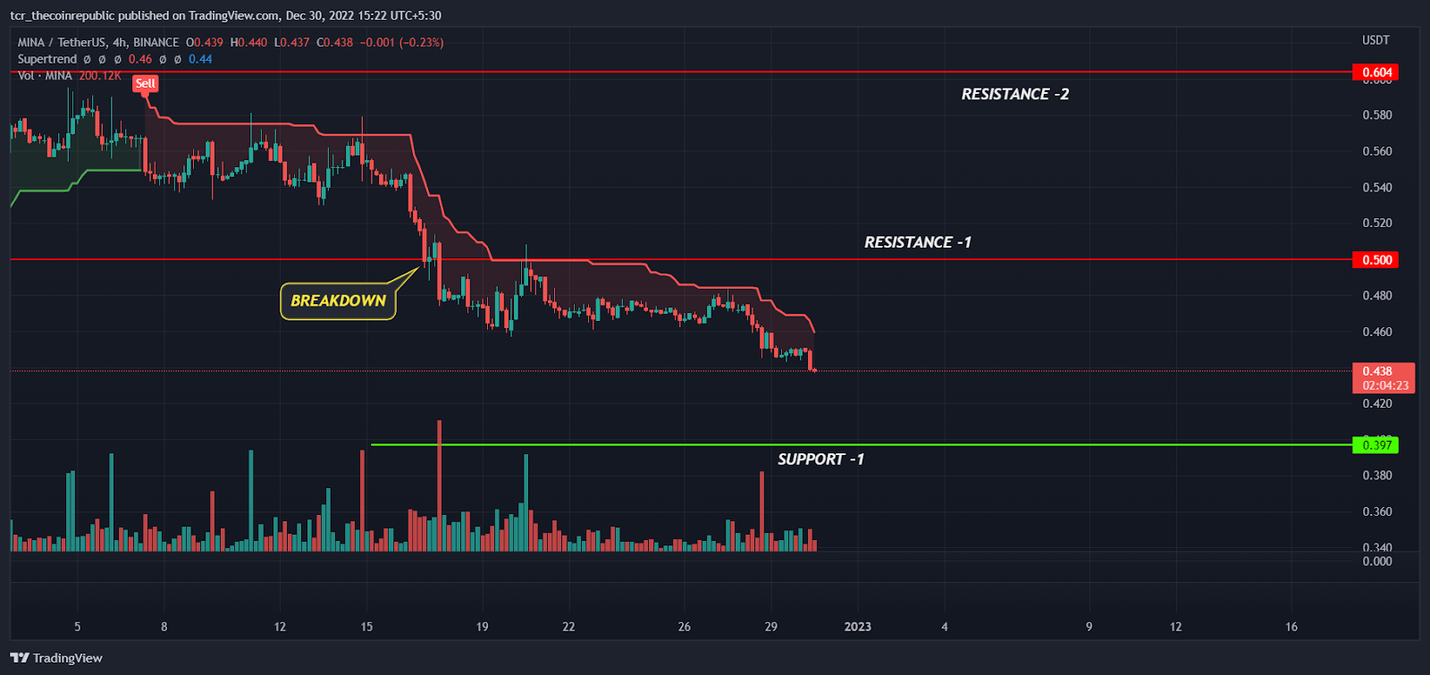 On a lower time frame, MINA price chart is similar to higher time. The yearly low breakdown with the strong bearish candle indicates the bear’s dominance in the higher levels. The supertrend indicator has generated a sell signal and red line continuously trailing down indicates short term trend may stay into the bear grip. However, if bulls succeed to reclaim $0.500 level we may see some temporary pullback rallies.