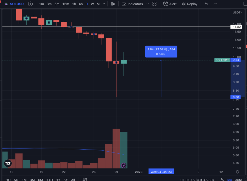 Solana, once one of the largest holdings of Alameda Research, got hit worse after the collapse of the FTX group. This week, Solana’s price touched $8 from a high of $11.5 due to various adverse developments. But, since Thursday’s low of $8, the price has recovered more than 23%, trading at $9.95 as of writing.