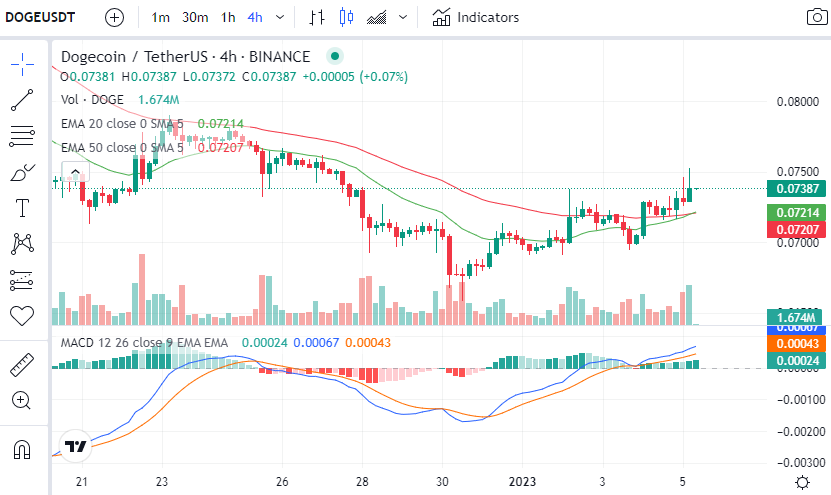 The price of DOGE is currently trading above the 20 and 50 EMA lines on its 4-hour chart, and was battling it out with the resistance level at $0.07377 at press time.
