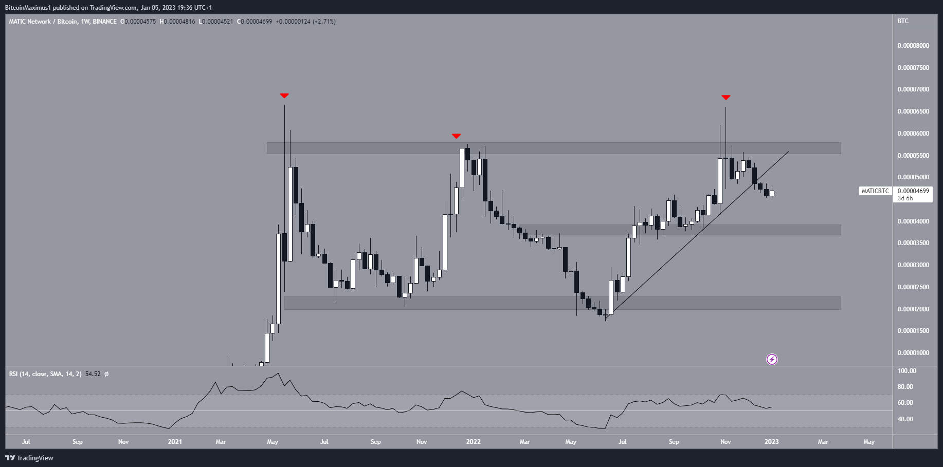 Due to the creation of a bearish pattern, the MATIC/BTC chart is also considered bearish unless the 57,000 Satoshi area is reclaimed.