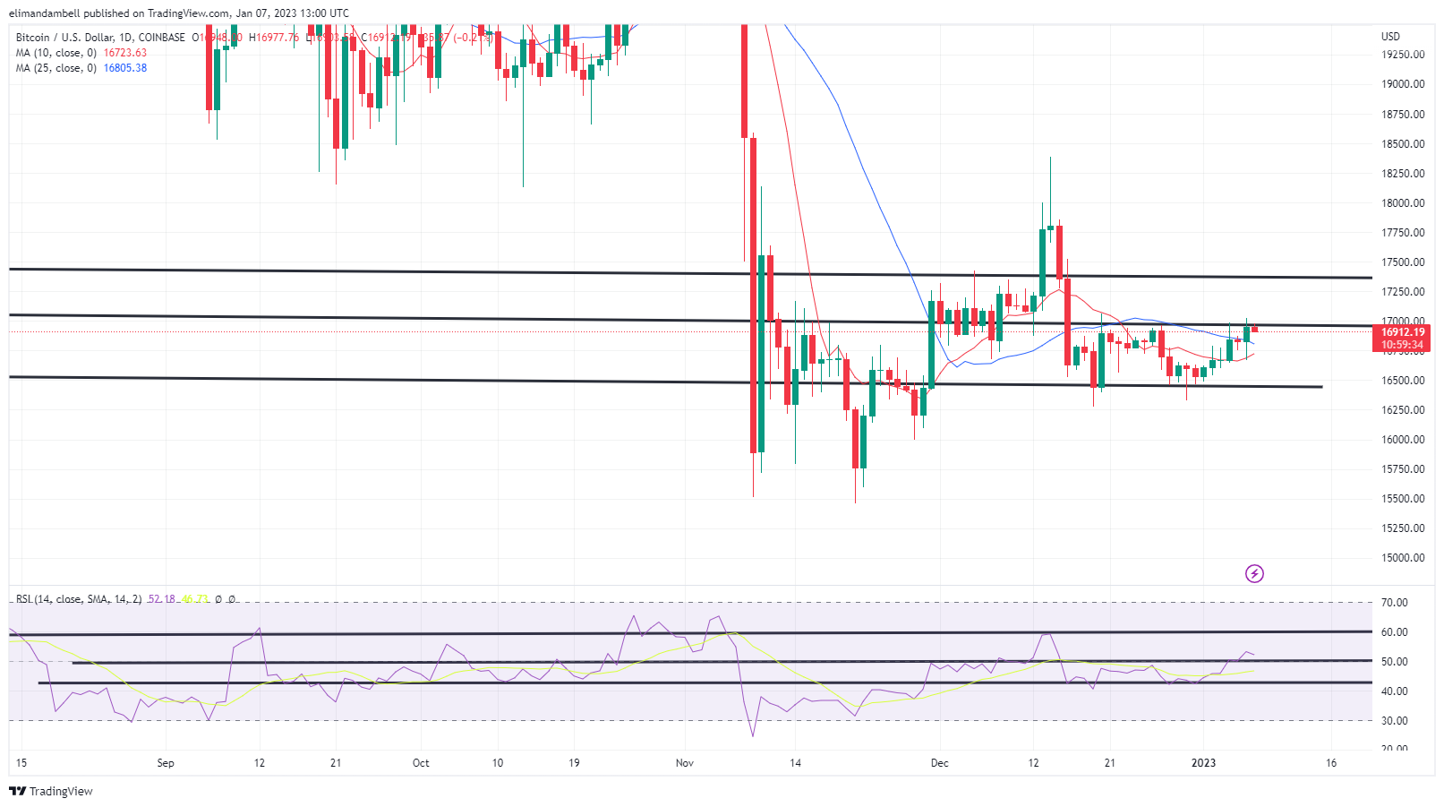 Bitcoin moved closer to the $17,000 level to start the weekend, as traders continued to react to the latest U.S. nonfarm payrolls data. December’s payrolls came in at 223,000, which was better than the 200,000 markets had expected. Ethereum was also higher on Saturday, with prices nearing a three-week high.