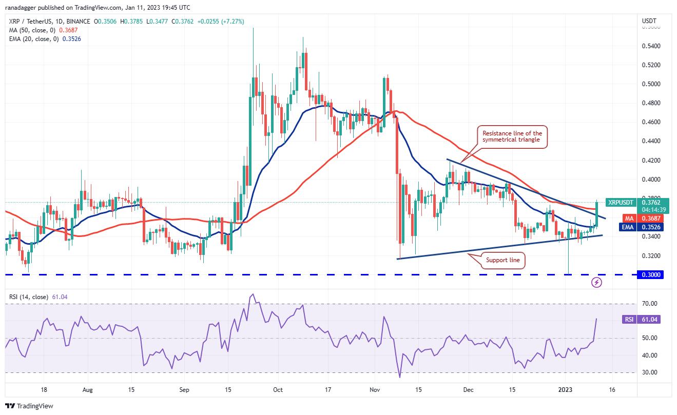 After trading inside the symmetrical triangle for the past several days, XRP (XRP) has made a strong move higher on Jan. 11. The bulls have pushed the price above the triangle and the 50-day SMA ($0.37).